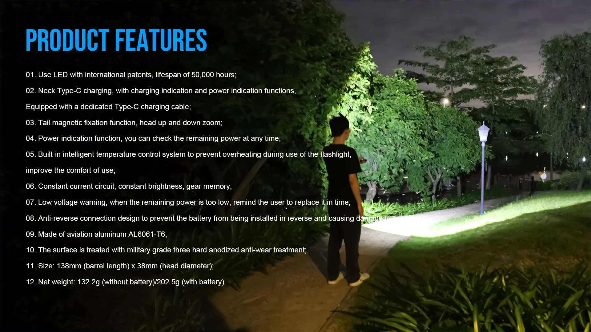 2.Cuando el voltaje de la batería es demasiado bajo, el brillo de la linterna se reducirá según el modo de brillo alto, brillo medio, brillo bajo, luz de cancela, y la advertencia de baja potencia se activará al mismo tiempo.Cuando la linterna tiene una advertencia de baja potencia (la luz indicadora de encendido parpadea en rojo y la luz principal parpadea), para evitar un agotamiento de energía, cargue el producto a tiempo;Cuando la linterna tarda mucho en cargarse debido al agotamiento de energía, verifique si hay materias extrañas en el puerto tipo C y vuelva a insertarla para cargar: cuando el producto esté completamente agotado y no se pueda encender, reemplace la batería o use un cargador con activación de 0 V para intentar activar la batería para cargar.Cambie al modo común cuando la linterna no esté en uso.El modo de descarga sólo es adecuado para cargar dispositivos móviles en situaciones de emergencia.No almacene la linterna en este modo, ya que este modo seguirá consumiendo el
