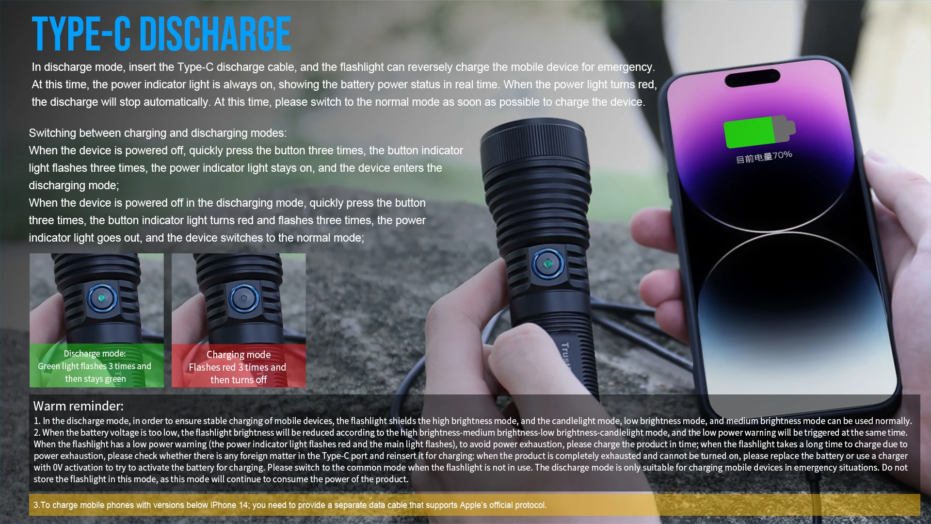 En el modo de descarga, inserte el cable de descarga tipo C y la linterna podrá cargar de forma inversa el dispositivo móvil en caso de emergencia. En este momento, la luz indicadora de energía siempre está encendida, mostrando el estado de energía de la batería en tiempo real.Cuando la luz de encendido se vuelve roja, la descarga se detendrá automáticamente.En este momento, cambie al modo normal lo antes posible para cargar el dispositivo.