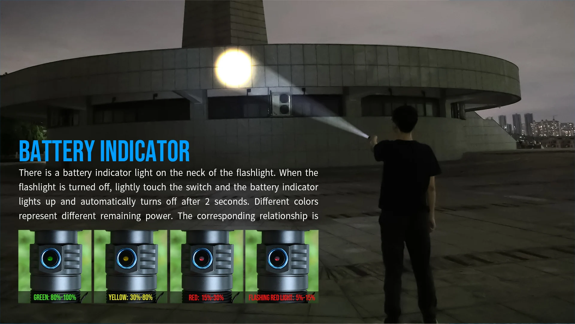 Hay una luz indicadora de batería en el cuello de la linterna.Cuando la linterna esté apagada, toque ligeramente el interruptor y el indicador de batería se iluminará y se apagará automáticamente después de 2 segundos.Diferentes colores representan diferentes potencias restantes.La relación correspondiente es: