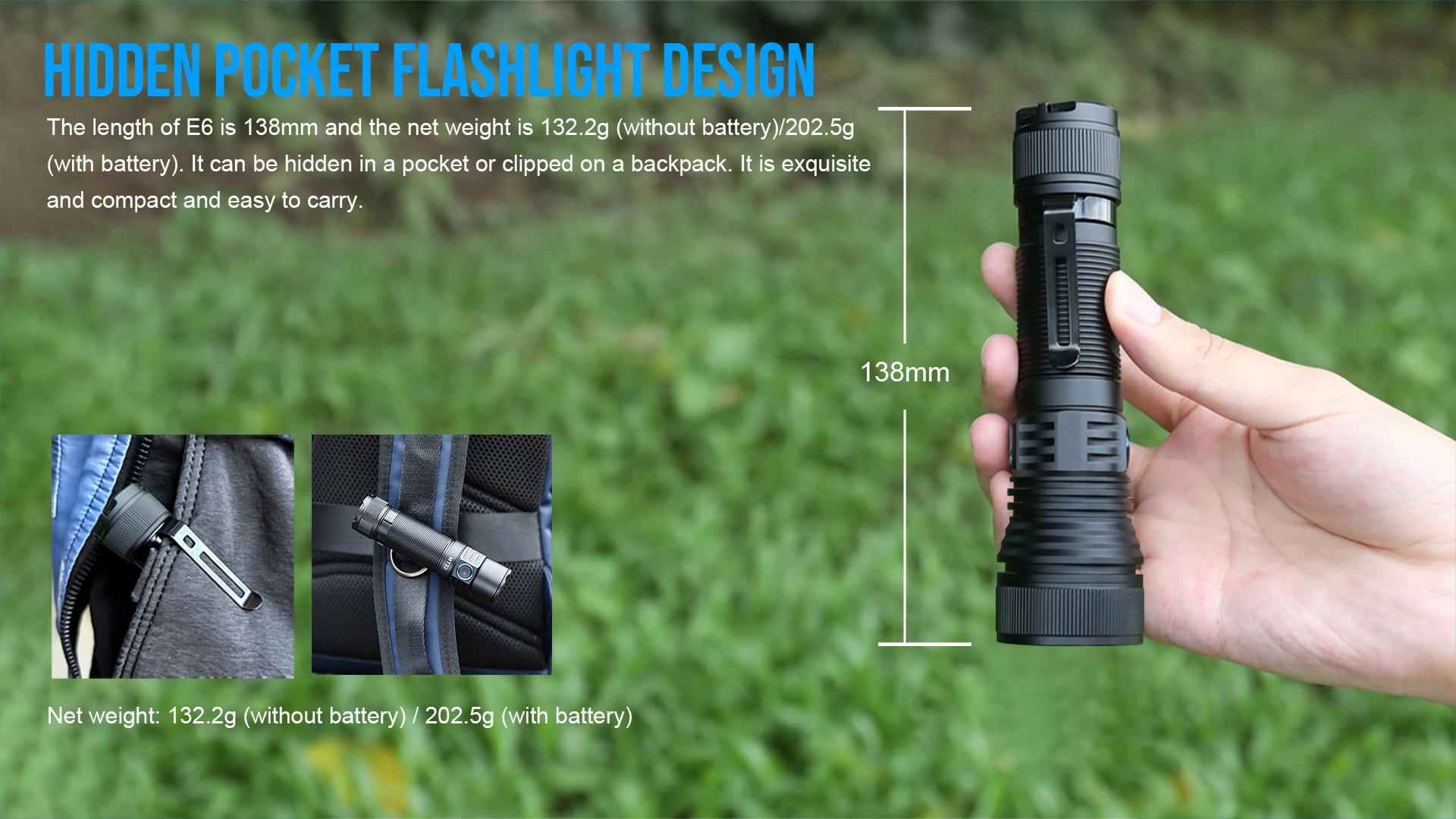 La longitud de E6 es de 138 mm y el peso neto es de 132,2 g (sin batería)/22,5 g (con batería).Se puede ocultar en un bolsillo o enganchar en una mochila.Es exquisito, compacto y fácil de transportar.