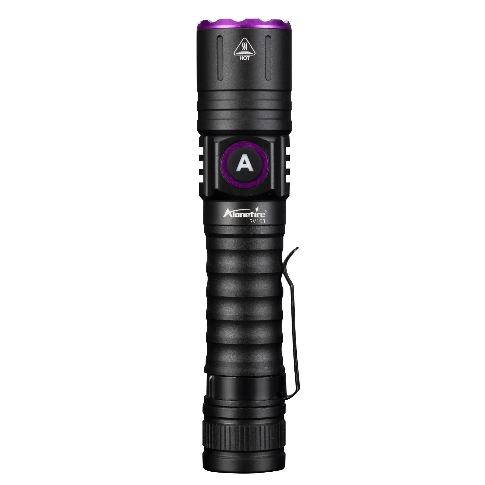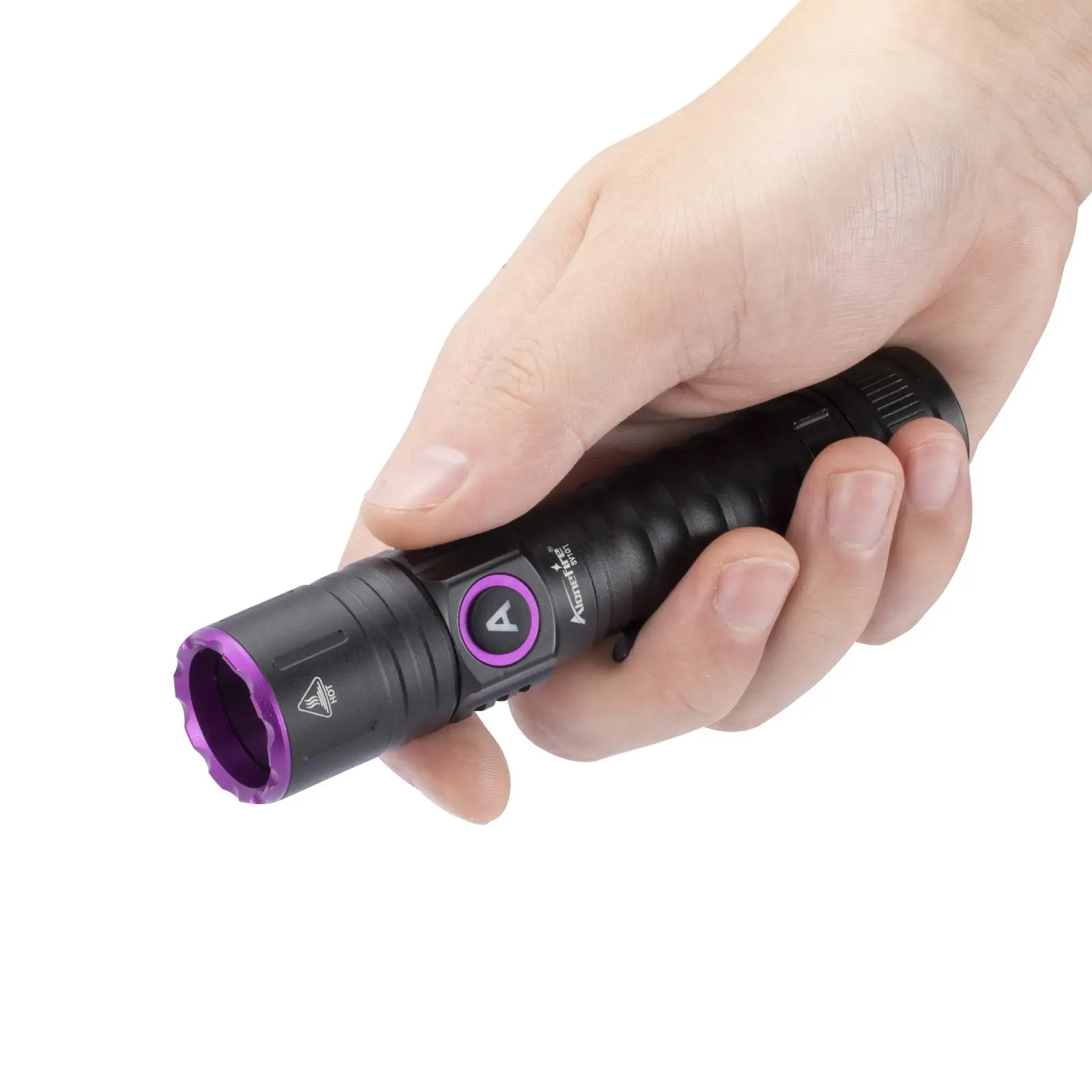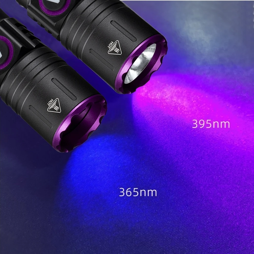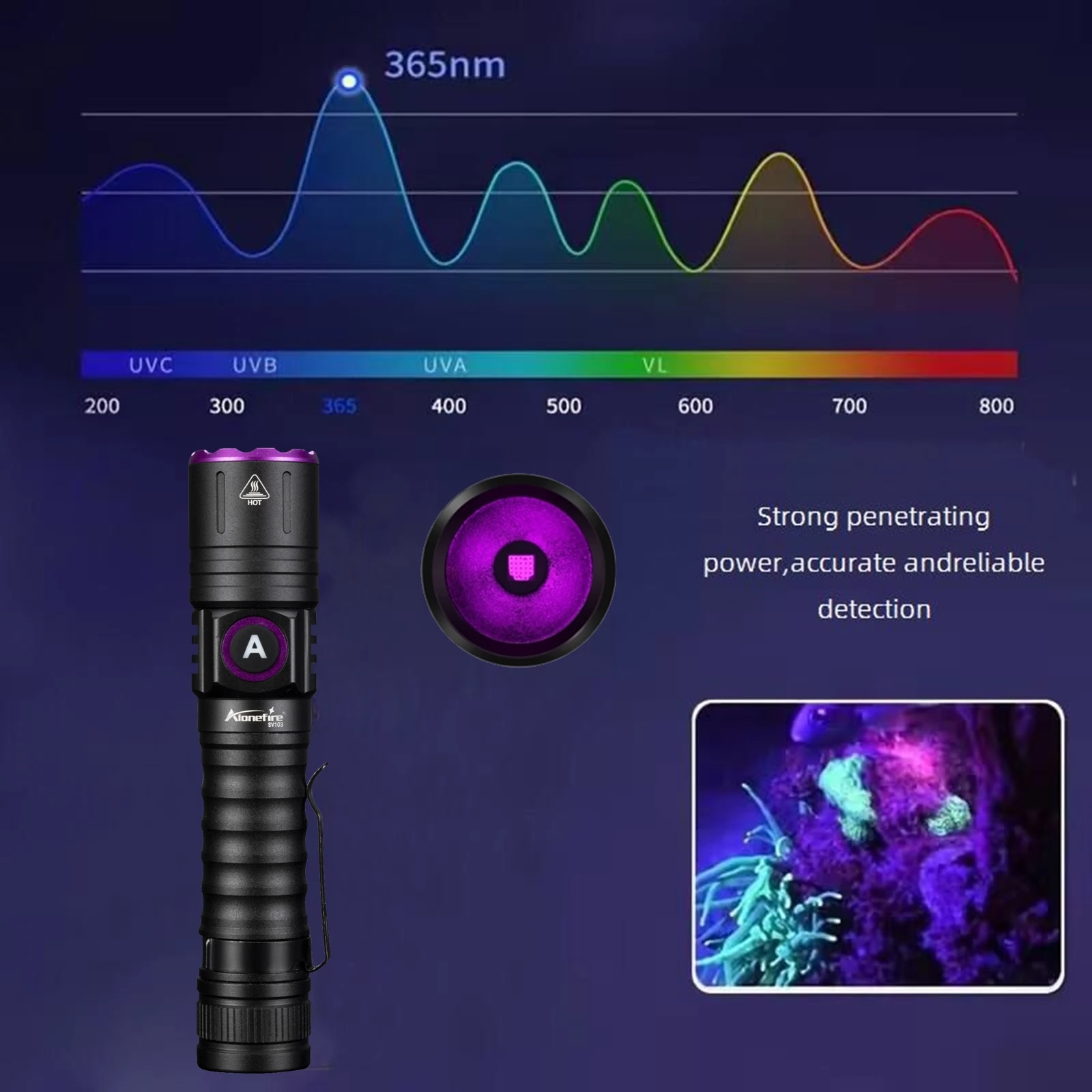 La luz ultravioleta de 365 nm es invisible a simple vista, por lo que no es tan BRILLANTE como la linterna de 395 nm, sino más perfecta para detectar una alta demanda como agentes fluorescentes y códigos de seguridad.UV de 365 nm es el espectro de detección realmente dedicado.Se puede utilizar con luz natural y funciona mejor en la oscuridad con poca fuga de luz visible.Se puede utilizar como detector de orina para mascotas (perros/gato)/escorpión/buscador/fluorescente/detector/moneda/licencia/tarjeta/