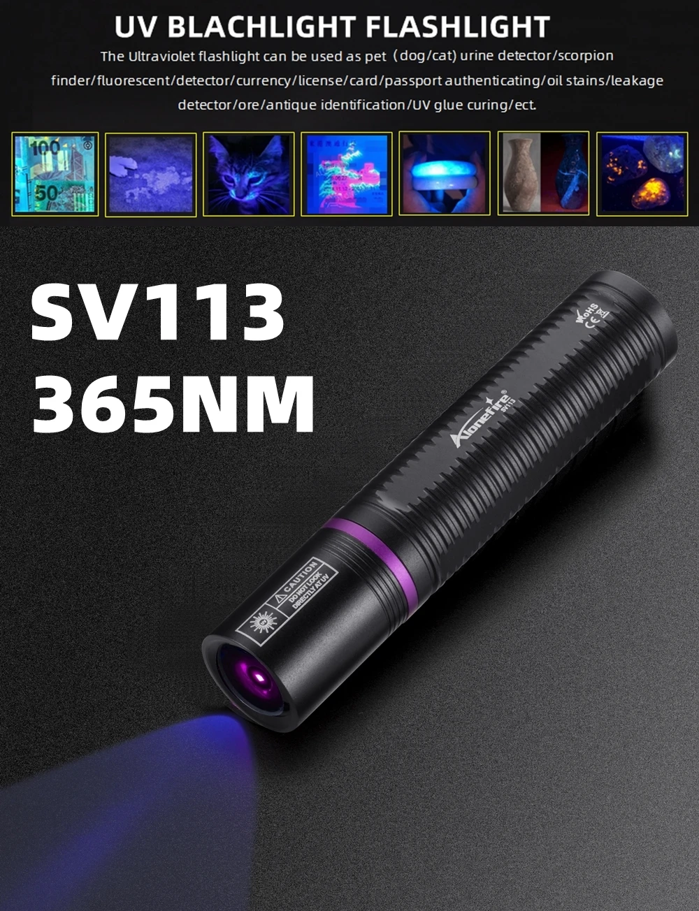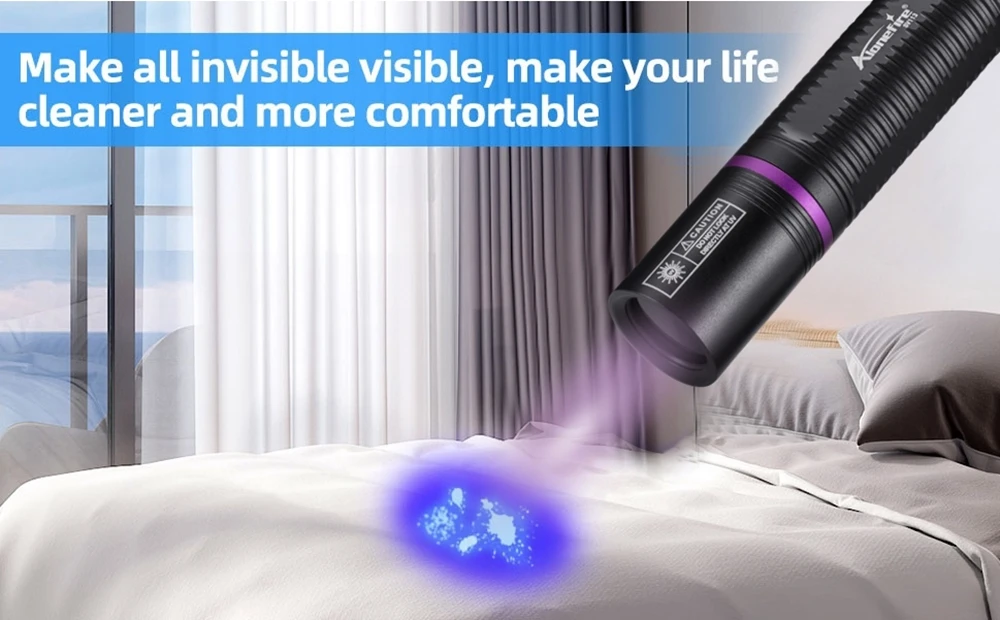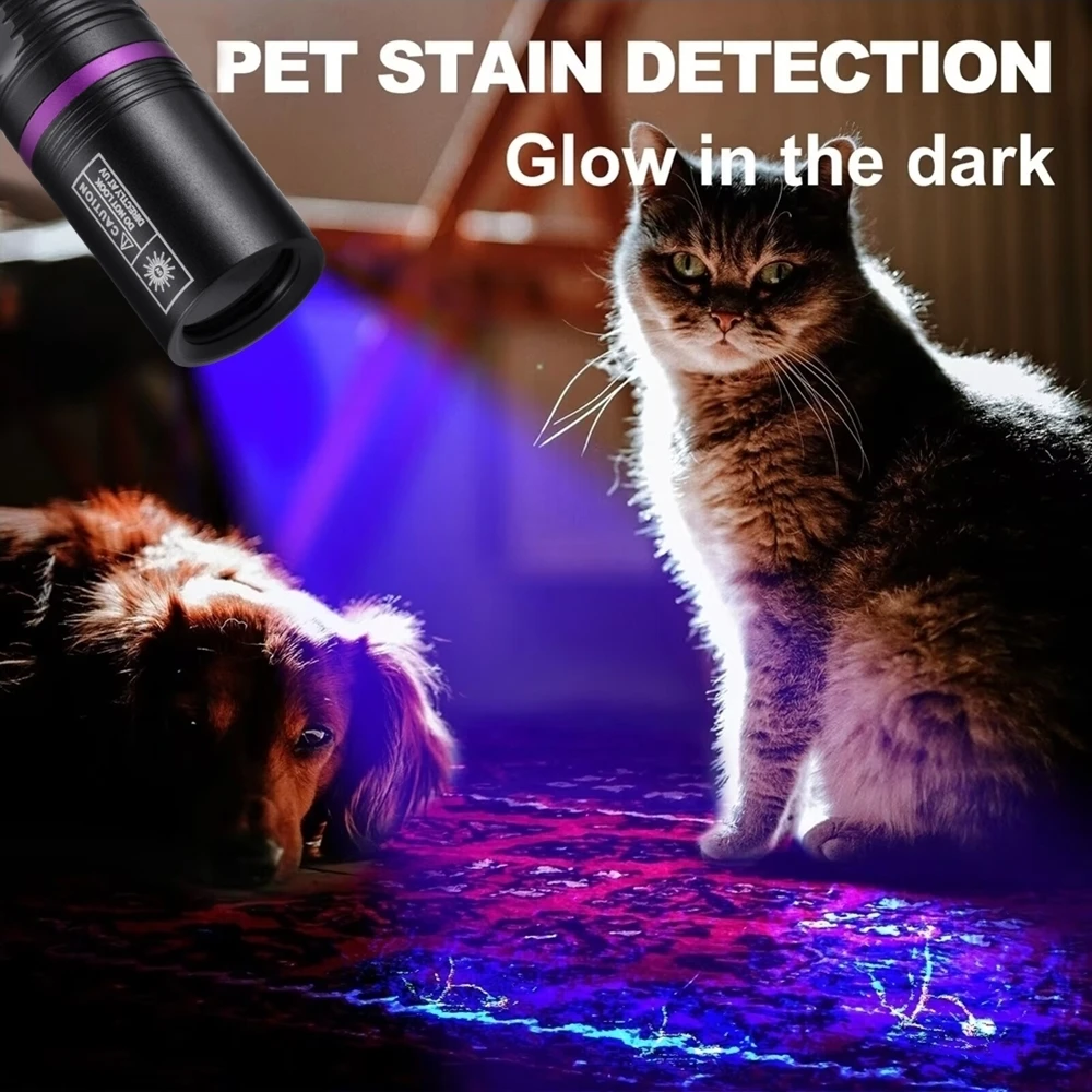 La linterna ultravioleta se puede utilizar como detector de orina para mascotas (perros/gato)/escorpión/autenticación de pasaporte/buscador/fluorescente/detector/moneda/licencia/tarjeta, etc. (En un ambiente oscuro, ¡el efecto de detección de luz violeta UV es mejor!)