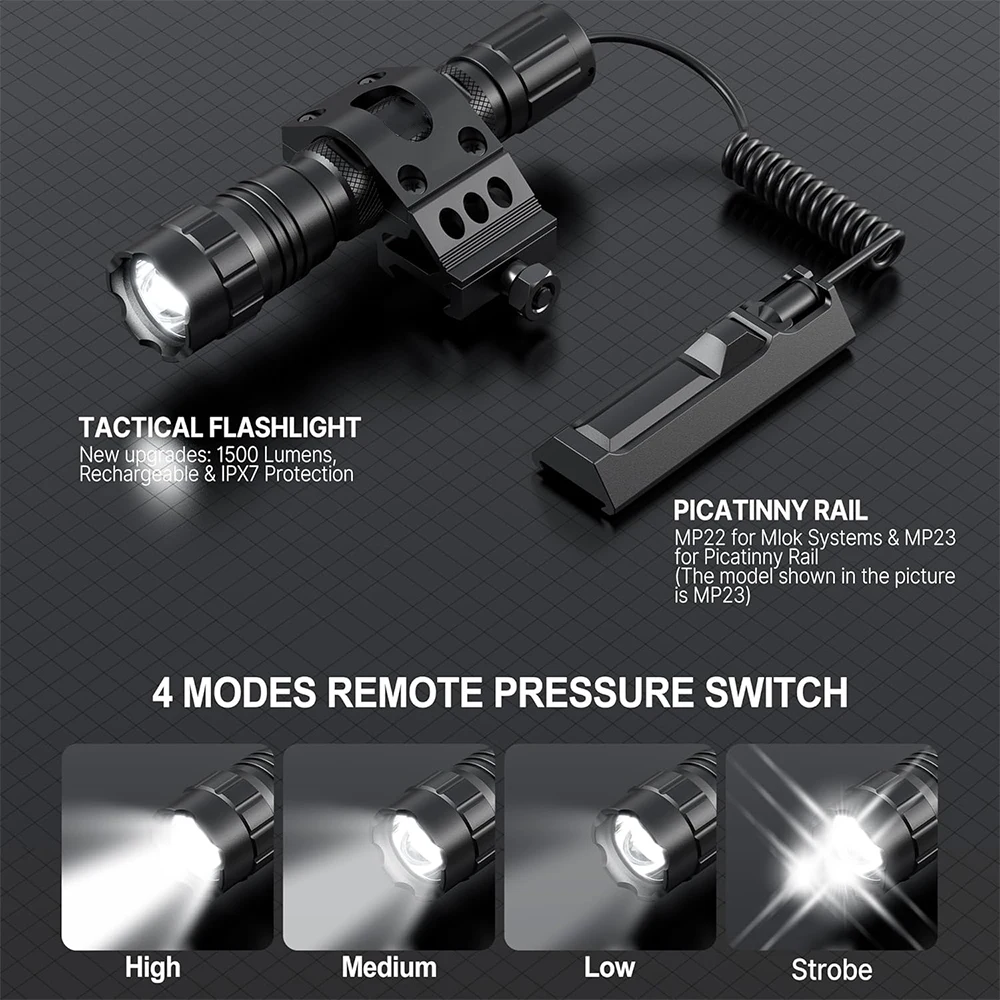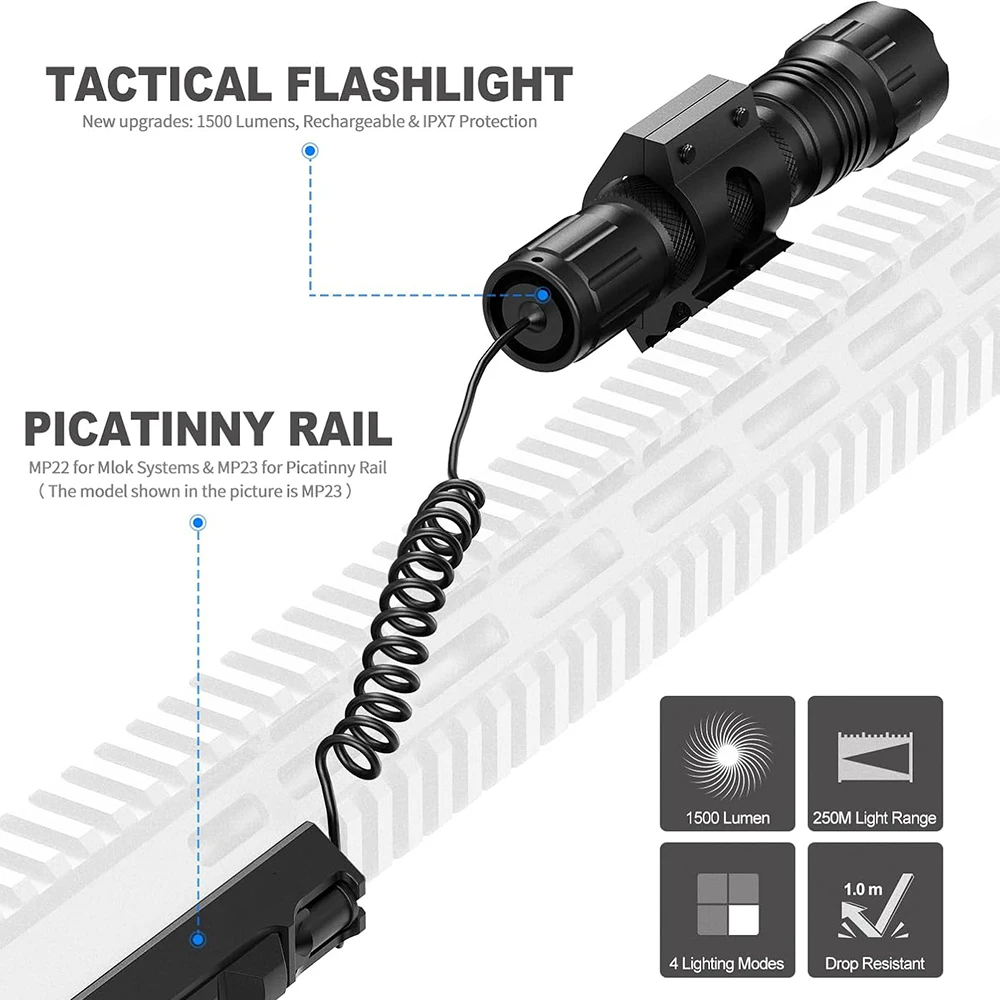 3.【Aplicabilidad más amplia】El soporte desplazado Picatinny incluido puede fijar firmemente la linterna de airsoft a los rieles, el interruptor de presión trasero está equipado con dos soportes diferentes Picatinny y Mlok para fijar en la parte superior de los rieles, capacidad de usarse con diferentes armas de fuego y rieles mejora enormemente la comodidad y adaptabilidad.