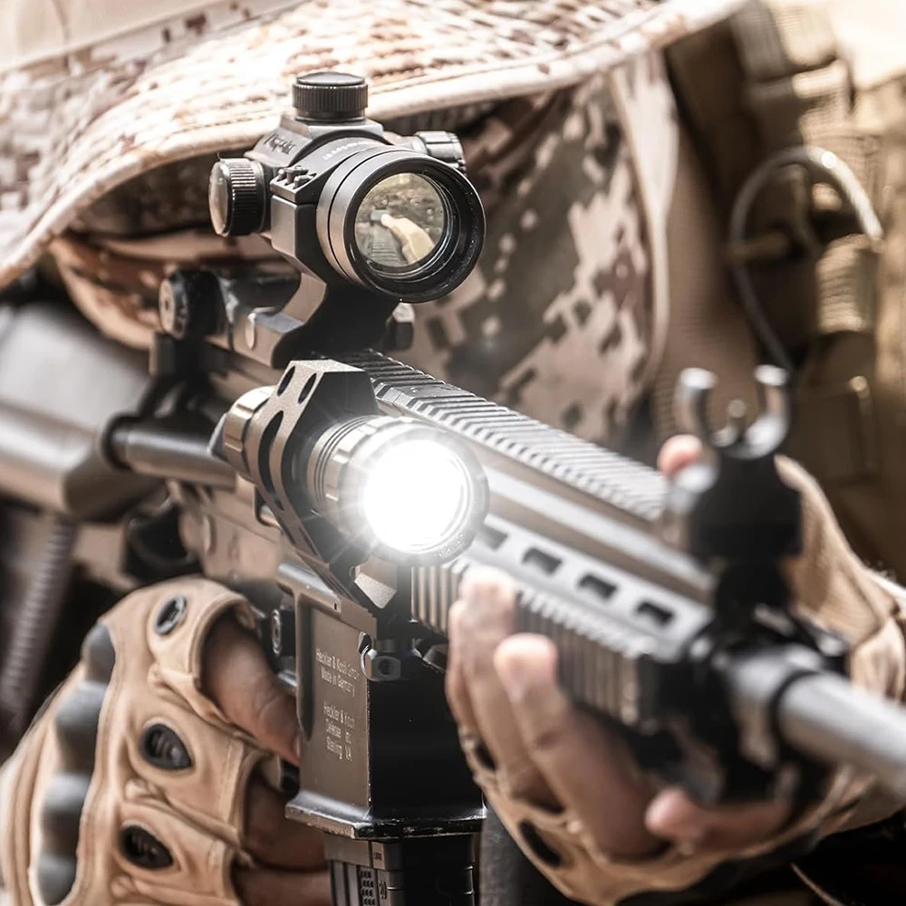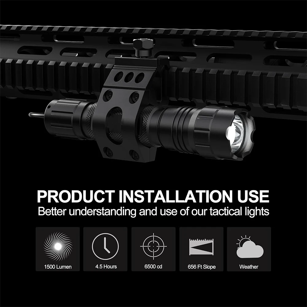 4. 【Protección IPX7】 La linterna para rifle aún se puede usar normalmente en un ambiente con una profundidad de agua de 1 m, el material de aleación de aluminio de grado aeronáutico garantiza la estabilidad a -20°C-40°Temperatura C, la superficie está anodizada para ser más resistente al desgaste y resistente, y es un socio confiable en cualquier entorno.