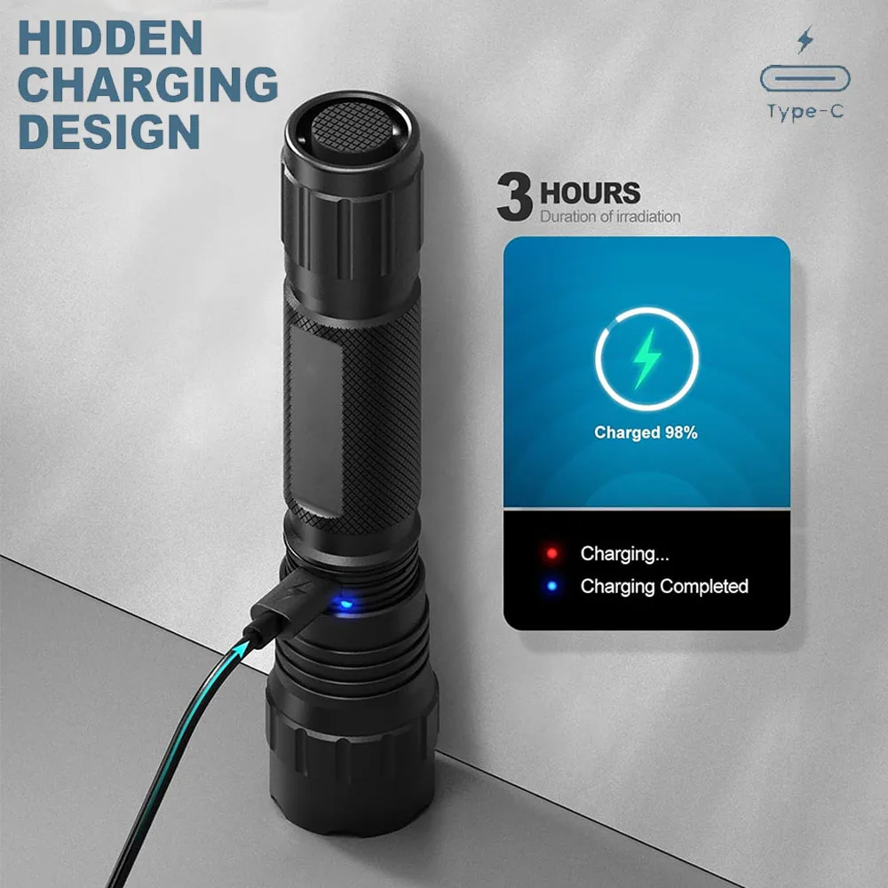 2. 【Recargable】 Gire el cabezal de la linterna para abrir el puerto de carga, a través del cable de datos tipo C incluido para cargar, indicador rojo para cargar, azul para completar la carga, proporciona 4,5 horas de luz en solo 2 horas.Mayor vida útil, menor riesgo de sustitución y pérdida de la batería.