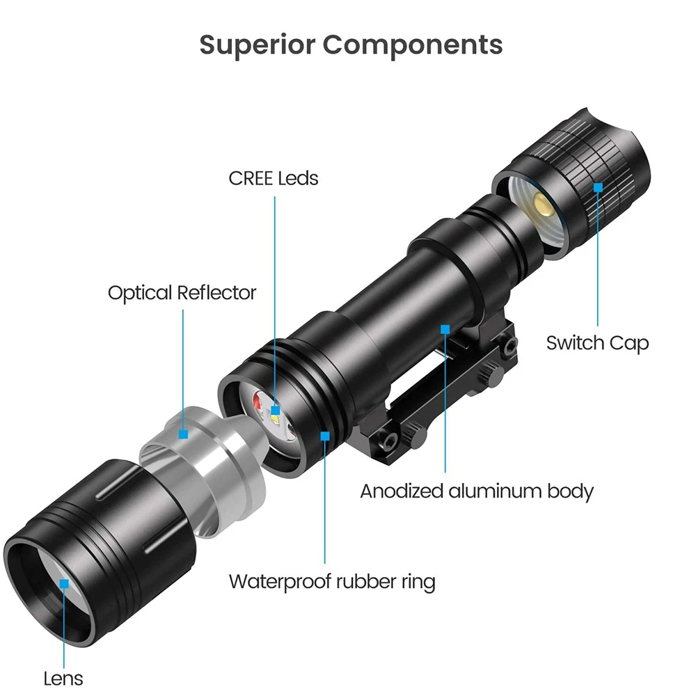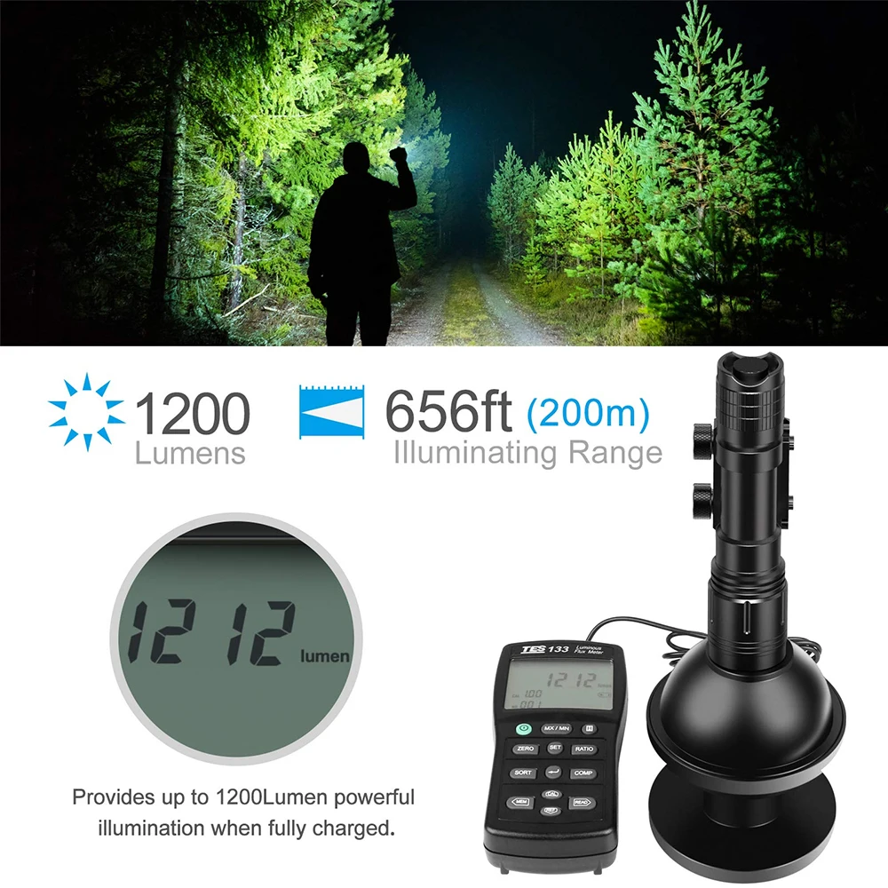Un LED prácticamente indestructible a prueba de retroceso genera 1200 lúmenes de luz blanca cegadora y continúa produciendo luz de nivel táctico durante 3 horas y 200 metros de haz.