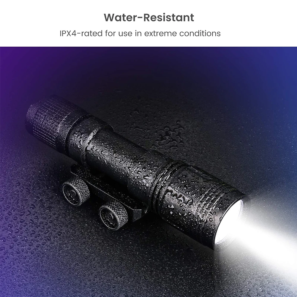 El aluminio aeroespacial anodizado duro mecanizado, la junta tórica doble y los sellos de junta ofrecen un nivel de impermeabilidad IPX4, lo que hace que la luz sea resistente, duradera y esté lista para el combate.