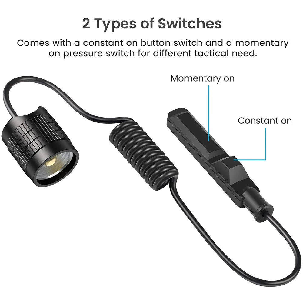 Utiliza un interruptor remoto con operación momentánea/constante o un interruptor trasero con botón para diferentes necesidades tácticas.Los usuarios tácticos y militares disfrutarán de la tapa trasera de doble interruptor que permite una fácil operación con una sola mano.Presione el botón trasero para cambiar, fácil de controlar.