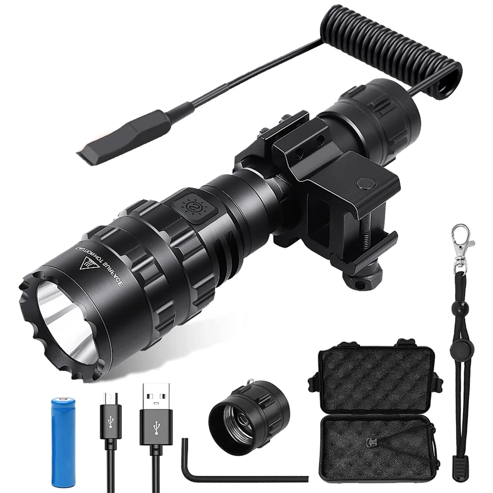 【Duradero y resistente al agua IPX6 】 la linterna táctica led está hecha de aleación de aluminio de grado aeronáutico T6061 con acabado mate anodizado negro, lo que la hace duradera, antiabrasiva y a prueba de golpes. La linterna picatinny tiene juntas tóricas impermeables selladas en ambos extremos, por lo que se puede utilizar en días lluviosos.