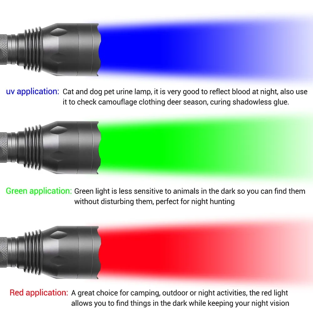 1. 【3 colores en 1 luz LED】 La linterna RGB tiene 3 fuentes de luz LED individuales (rojo, verde, UV 365 nm).Cada luz se utiliza para un propósito diferente (luz blanca para iluminación diaria, luz roja para visión nocturna, luz verde para caza al aire libre y luz UV de 365 nm para identificar moneda, fluorescentes y escorpiones).Una linterna puede satisfacer sus necesidades en diferentes escenarios.