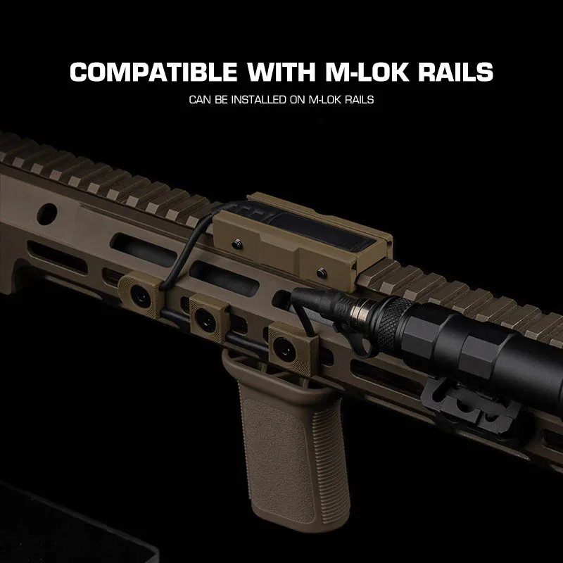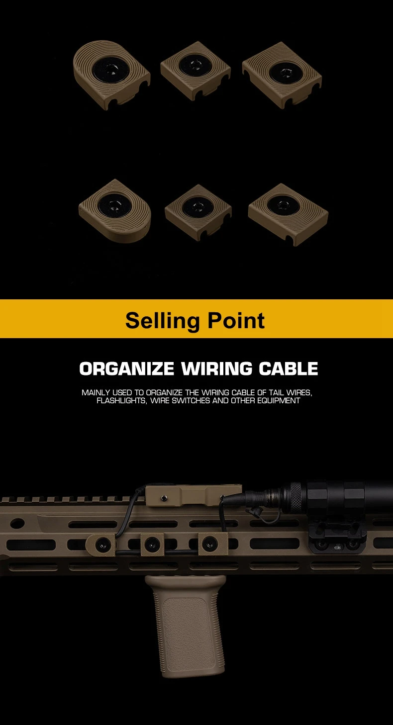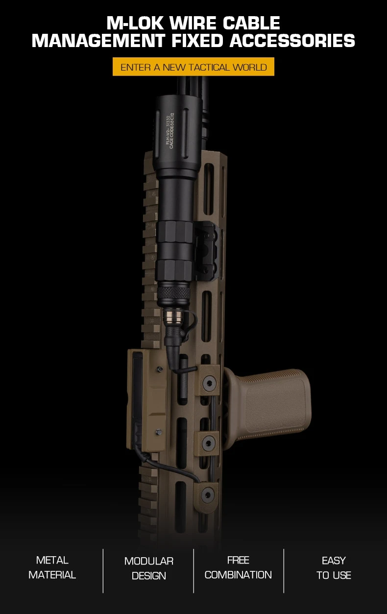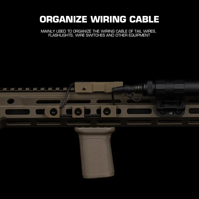 Our Wire Guide metal wire holding system starts from the bottom. We start with the M-LOK system to make it have the greatest versatility. We designed three independent parts of the system to allow for unparalleled routing and security options. The first and most fundamental three are the Thru guide. There are two channel feeders parallel to the M-LOK slot here. This is the main force of the system. You can use multiple such circuits and fix the extra wires behind the lamp. Next comes the right-angle guide. Its main purpose is to pick up the wire and, as its name suggests, rotate it by 90 degrees. In this way, if you run a switch on your top rail, you can take it off from the 12 o 'clock position and tie it behind your lamp. It can also be used for vertical passage. The last piece of the puzzle is our conclusion guide. The main purpose of this fixture is to styably pull out loose wires and, if necessary, reduce the risk of one obstacle. When the wire goes in, the direction it comes out at a full 180 degrees is the same as the direction it goes in.
