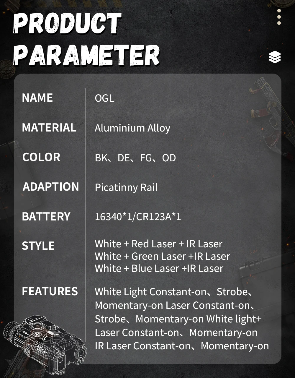 CARACTERÍSTICAS: Láser estroboscópico, Láser, Láser + Luz blanca, Luz blanca constante, Luz blanca estroboscópica, Luz blanca encendido momentáneo, Láser IR