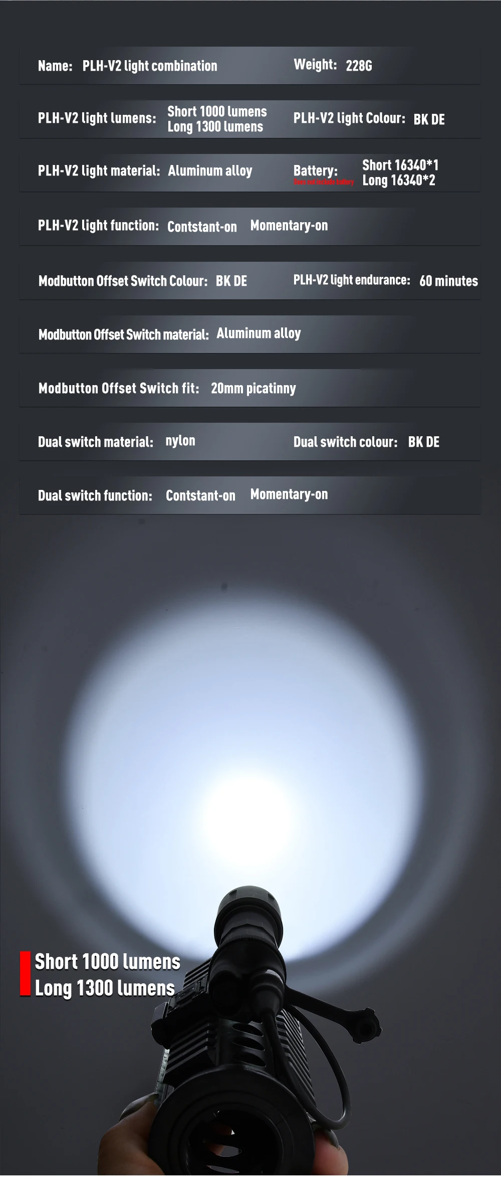 Linterna táctica PLH V2 UN Hot ModButton interruptor de presión remota para riel de 20mm de alta potencia 1300 lúmenes arma de caza Scoutlight