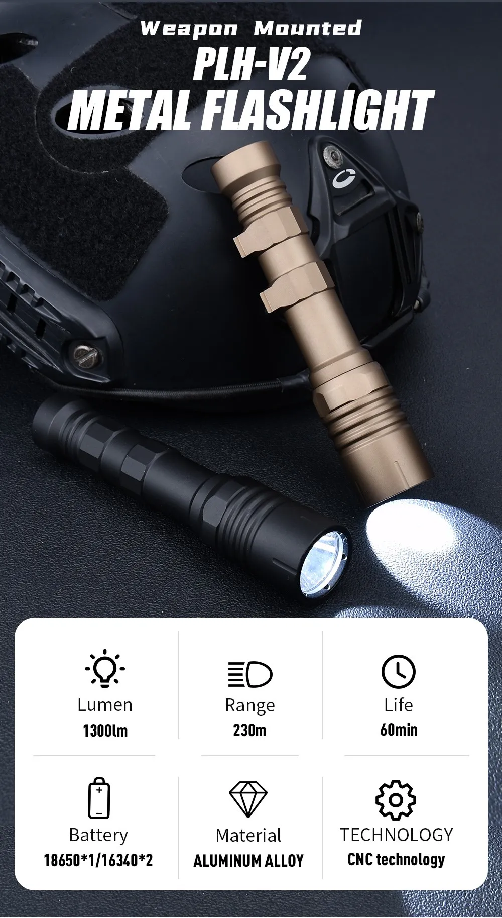 Nueva linterna táctica PLHv2 Metal Wadsn 1300 lúmenes LED blanco de alta potencia con base de antorcha Luz de explorador de caza Airsoft al aire libre