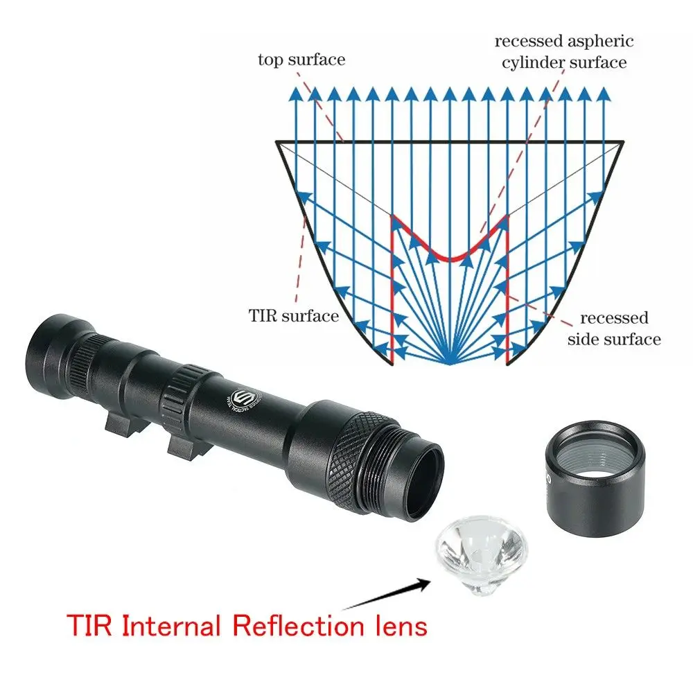 La lente patentada de reflexión total interna da forma a un haz enfocado para iluminación de largo alcance y al mismo tiempo proporciona un amplio derrame para visión periférica, ideal tanto para CQB en interiores como para compromisos en exteriores.