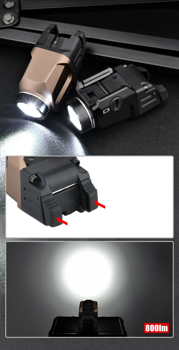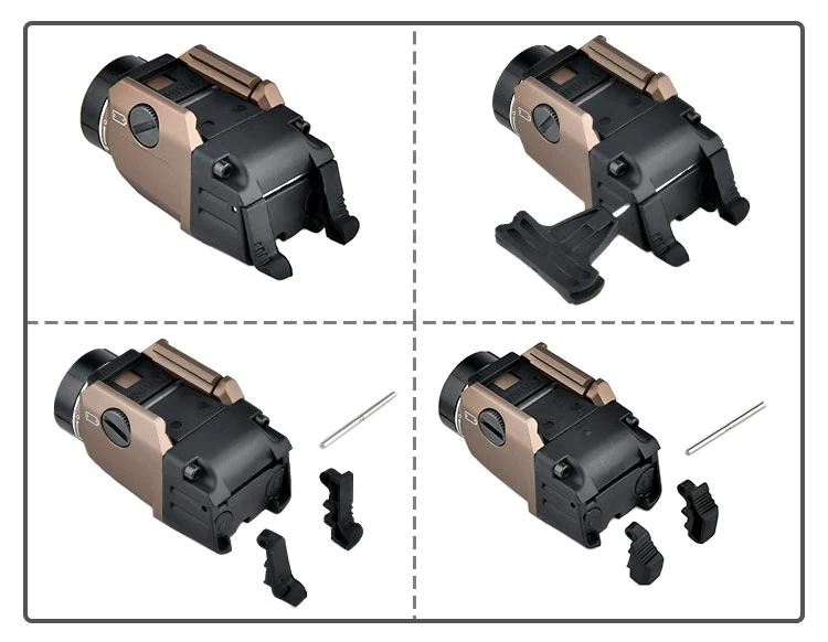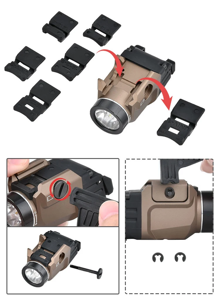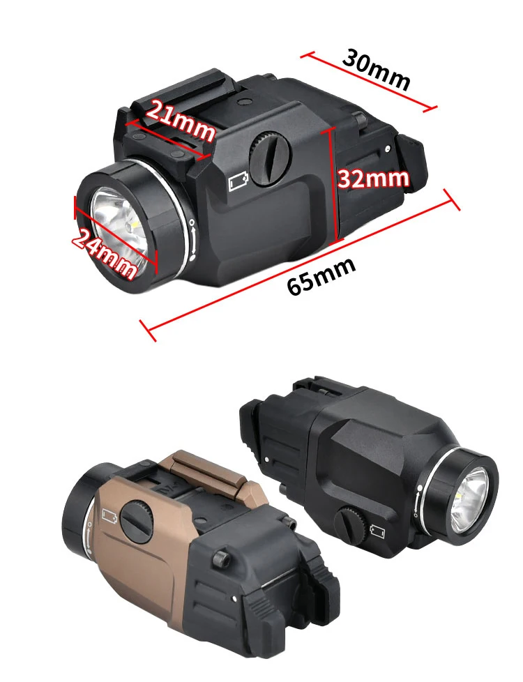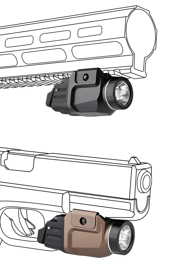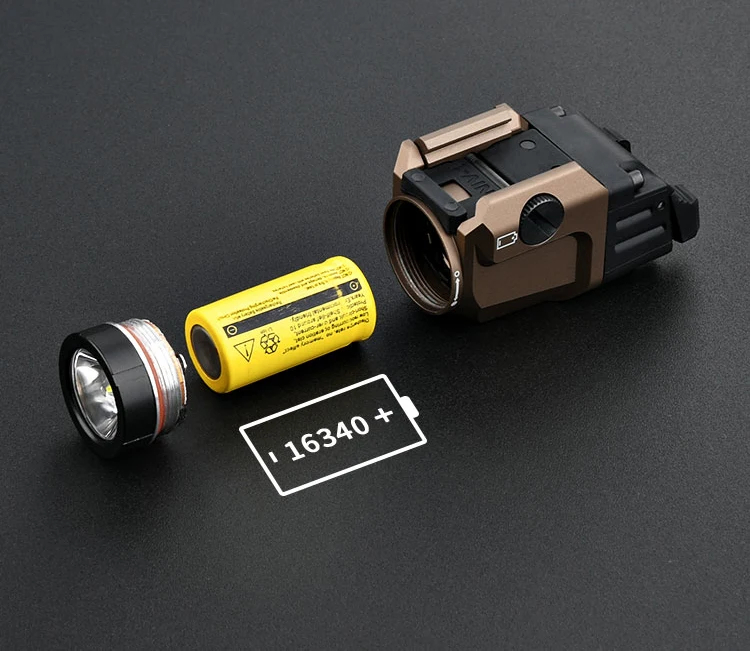 La linterna es realmente muy potente, creo que tiene más de 500 lúmenes reales. Para activarla, necesitas insertar la batería y atornillar completamente la parte LED. Se atasca un poco más, pero simplemente sigues presionando hasta el final y se activa sin problemas. Encaja perfectamente en mi Glock 19, quedando cerca de la boca del cañón, activación muy suave y segura.
