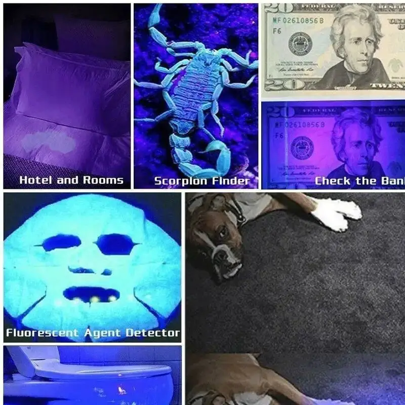 La linterna ultravioleta se puede utilizar como detector de orina para mascotas (perros/gatos)/buscador de escorpiones/fluorescente/detector/moneda/licenza/tarjeta/autenticación de pasaporte/manchas de aceite/detector de fugas/oro/identificación antigua/curado con pegamento UV/etc.