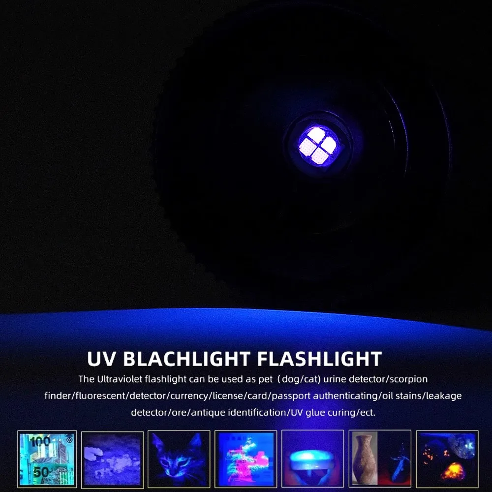 La linterna ultravioleta se puede utilizar como mascota (perro/gato) detector de orina/detector de escorpión/fluorescencia/detector/moneda/licencia/tarjeta/certificación de pasaporte/aceite/detector de fugas/Mineral/identificación antigua/curado de pegamento UV