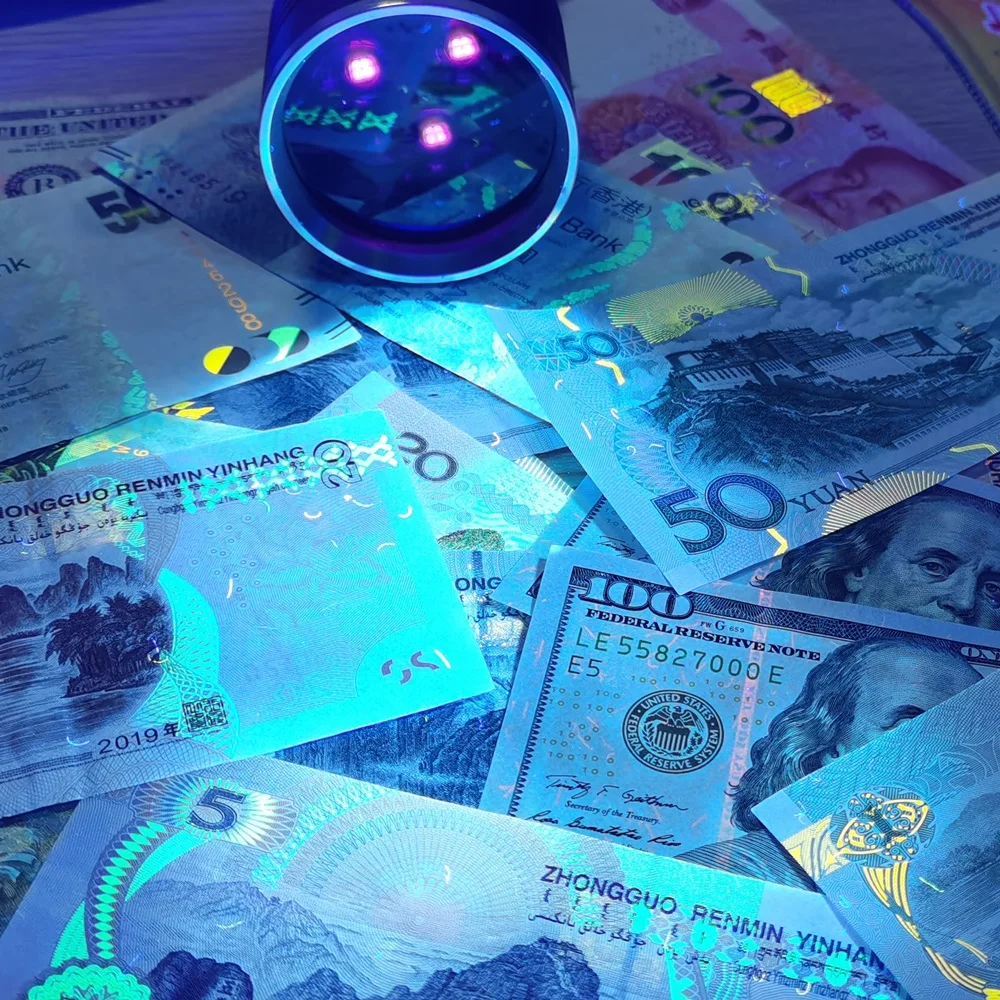 La luz ultravioleta de 365nm es invisible a simple vista, por lo que no es tan BRILLANTE como la linterna de 395nm, pero es perfecta para la detección de alta demanda como agentes fluorescentes y código de seguridad. 365nm UV es el verdadero espectro de detección dedicado. Se puede utilizar con luz natural y funciona mejor en la oscuridad con poca fuga de luz visible. Se puede utilizar como detector de orina para mascotas (perro/gato)/escorpión/buscador/fluorescente/detector/moneda/licencia/tarjeta/pasaporte auténtico/curado