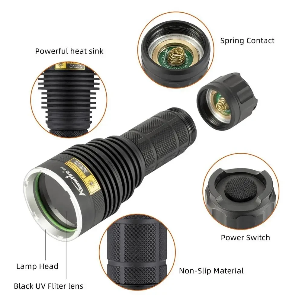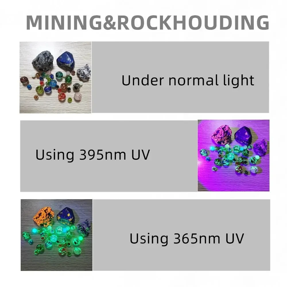 Peso: 243g/0,54 LB La luz ultravioleta de 365nm es invisible a simple vista, por lo que no es tan BRILLANTE como la linterna de 395nm, pero es perfecta para la detección de alta demanda como agentes fluorescentes y código de seguridad. 365nm UV es el verdadero espectro de detección dedicado. Se puede utilizar con luz natural y funciona mejor en la oscuridad con poca fuga de luz visible. Se puede utilizar como detector de orina para mascotas (perro/gato)/escorpión/buscador/fluorescente/detector/moneda