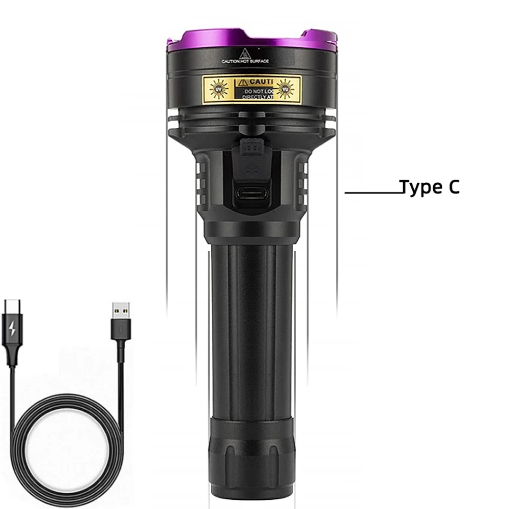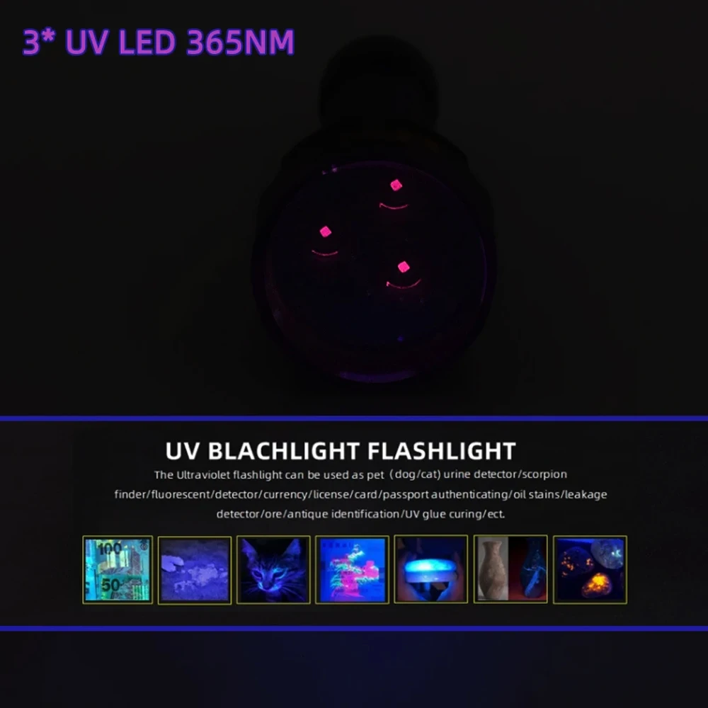 La linterna UV se puede utilizar como detector de orina para mascotas (perros/gatos)/detector de escorpiones/lámpara fluorescente/detector/moneda/licencia/tarjeta/autenticación de pasaporte/manchas de aceite/detector de fugas/oro/identificación antigua/durecimiento con pegamento UV.
