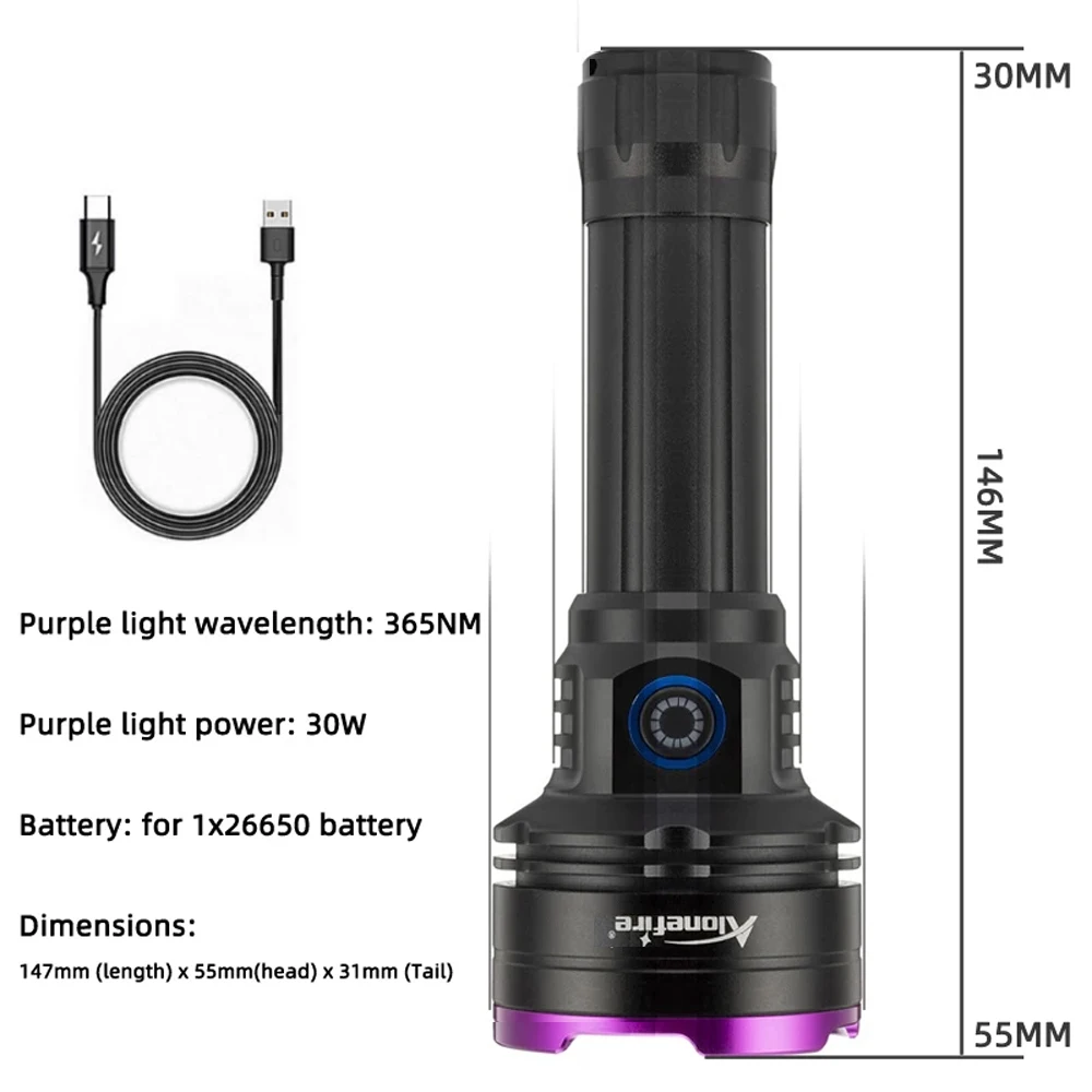 【NUESTRA LUZ ULTRAVIOLETA MÁS POTENTE】-- La luz ultravioleta 365 del mercado puede estar limitada a una única fuente de luz y el haz no puede llegar más lejos (garantizando alta intensidad al mismo tiempo).Nuestra linterna ultravioleta con foco de alta potencia de 36 W viene con 3 fuentes de luz LED P50 de cuatro núcleos originarias.La luz ultravioleta de intensidad tres veces facilita la búsqueda de rocas minerales incluso durante el día.También es perfecto para la detección de fugas, verificación de grietas ocultas e iluminación de vidrio de uranio.