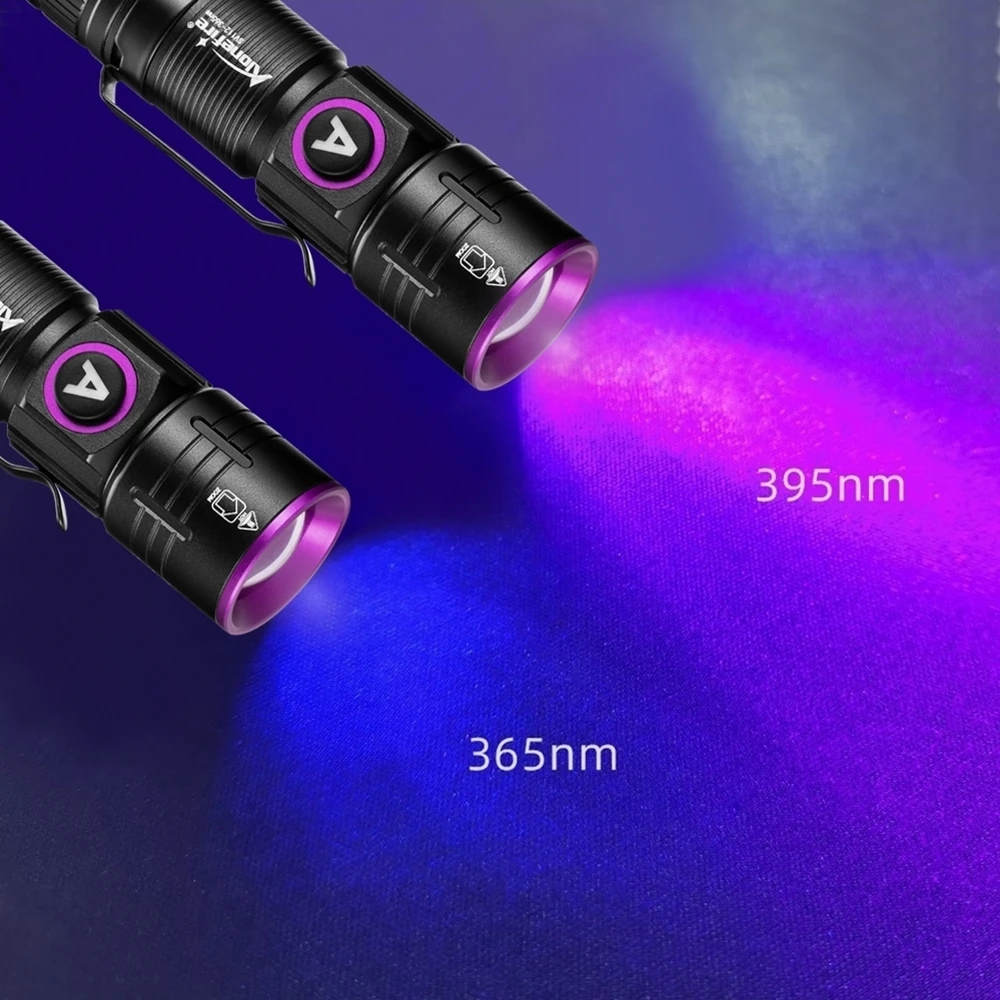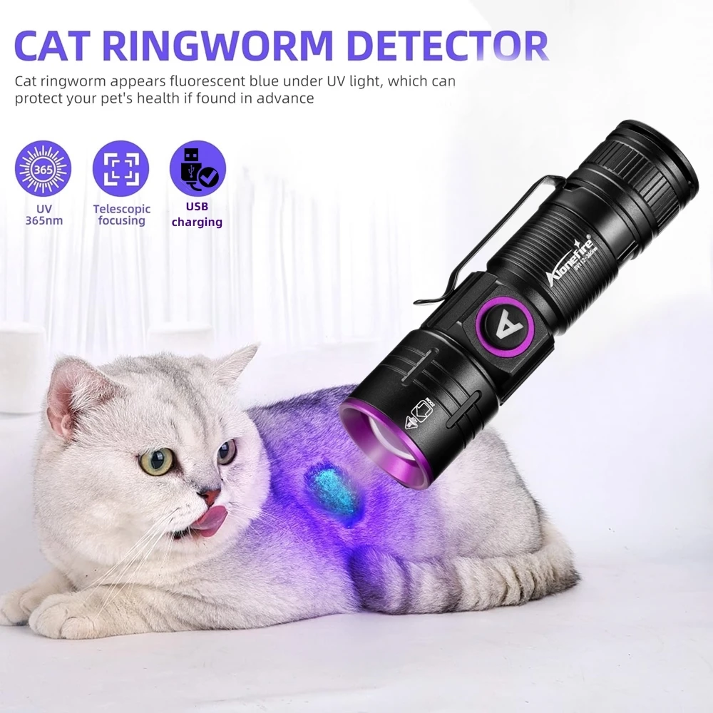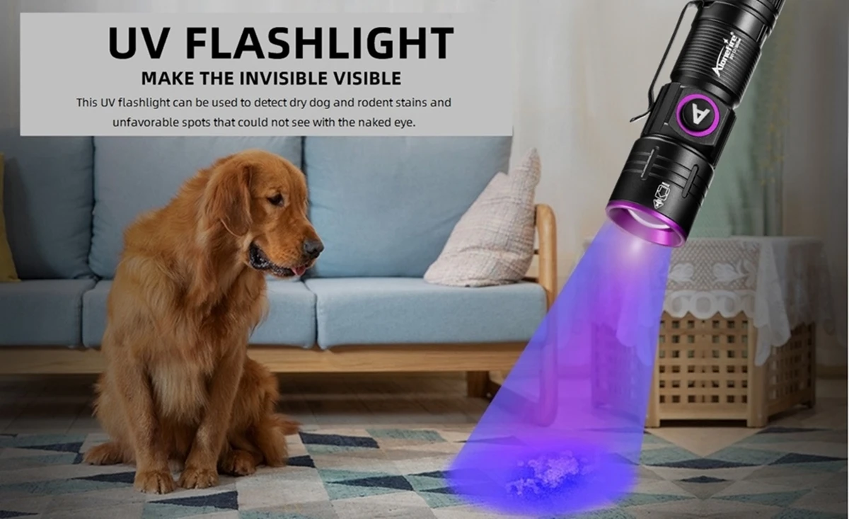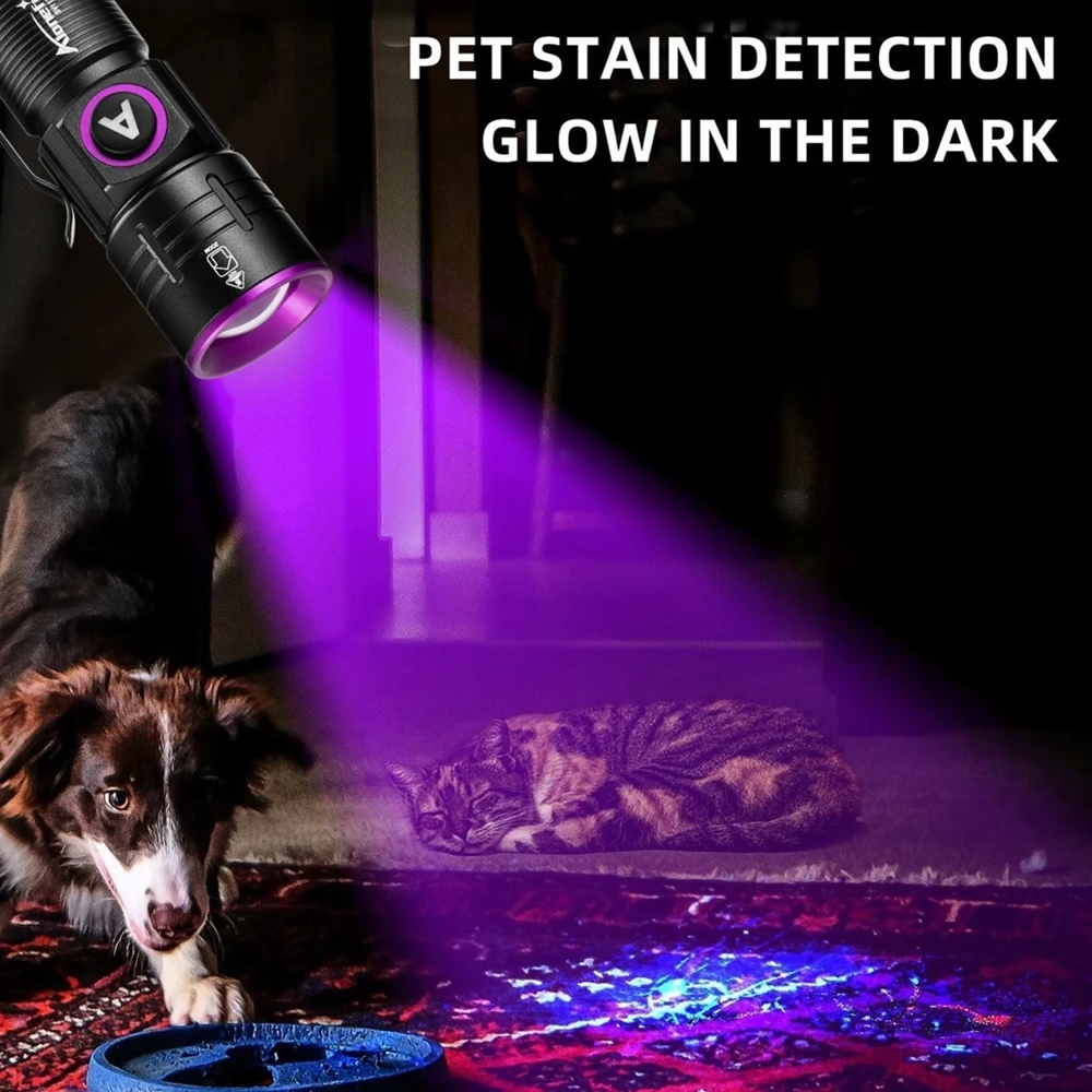 La linterna ultravioleta se puede utilizar como detector de orina para mascotas (perros/gato)/escorpión/autenticación de pasaporte/buscador/fluorescente/detector/moneda/licencia/tarjeta, etc. (En un ambiente oscuro, ¡el efecto de detección de luz violeta UV es mejor!)