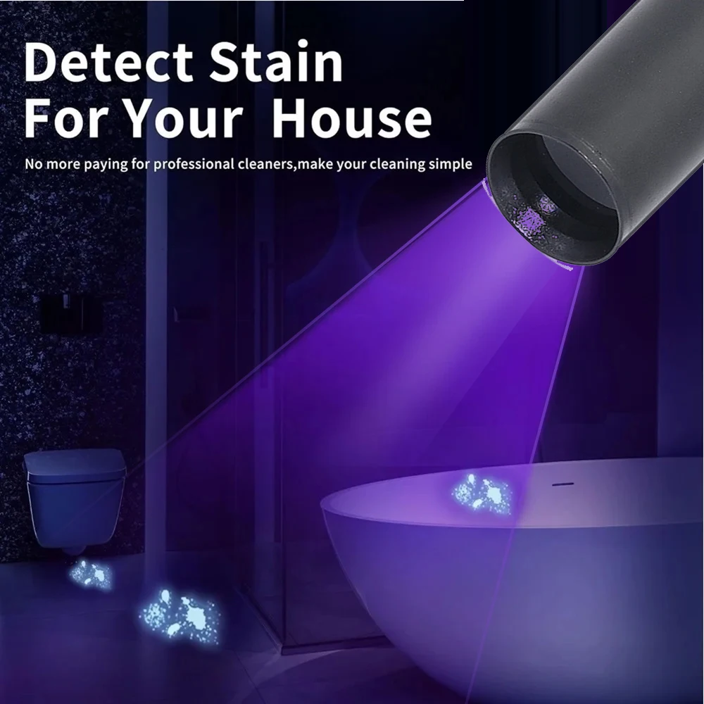 La linterna ultravioleta se puede utilizar como detector de orina para mascotas (perros/gatos)/buscador de escorpiones/fluorescente/detector/moneda/licenza/tarjeta/autenticación de pasaporte/manchas de aceite/detector de fugas/oro/identificación antigua/curado con pegamento UV/etc. (En un ambiente oscuro, ¡el efecto de detección de luz violeta UV es mejor!)