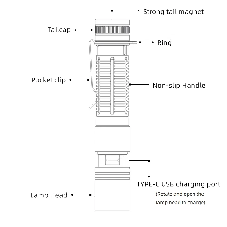 Modo de trabajo: 6 modos: luz débil-luz baja-luz media-luz alta-Luz Súper brillante-estroboscópica (cualquier engranaje puede hacer doble clic)