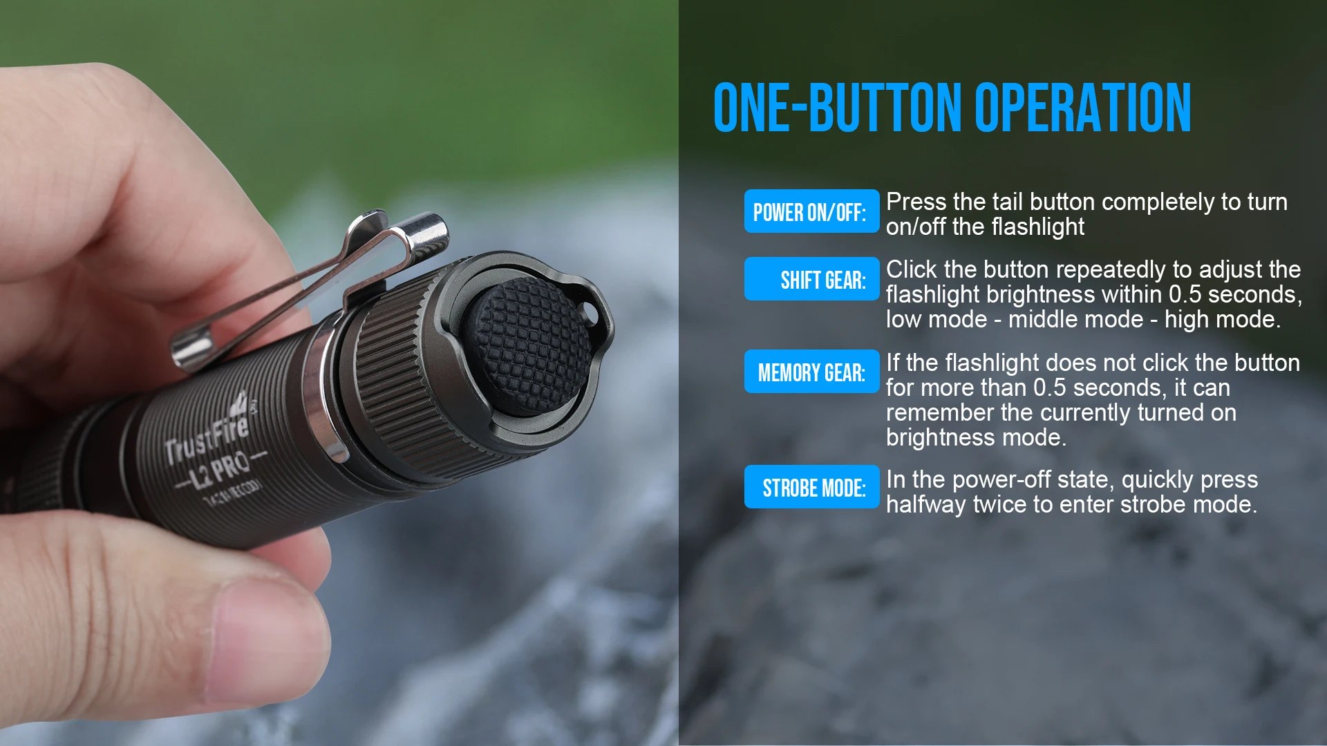 ENGRANAJE DE MEMORIA: si la linterna no hace clic en el botón durante más de 0,5 segundos, puede recordar el modo de brillo activado actualmente