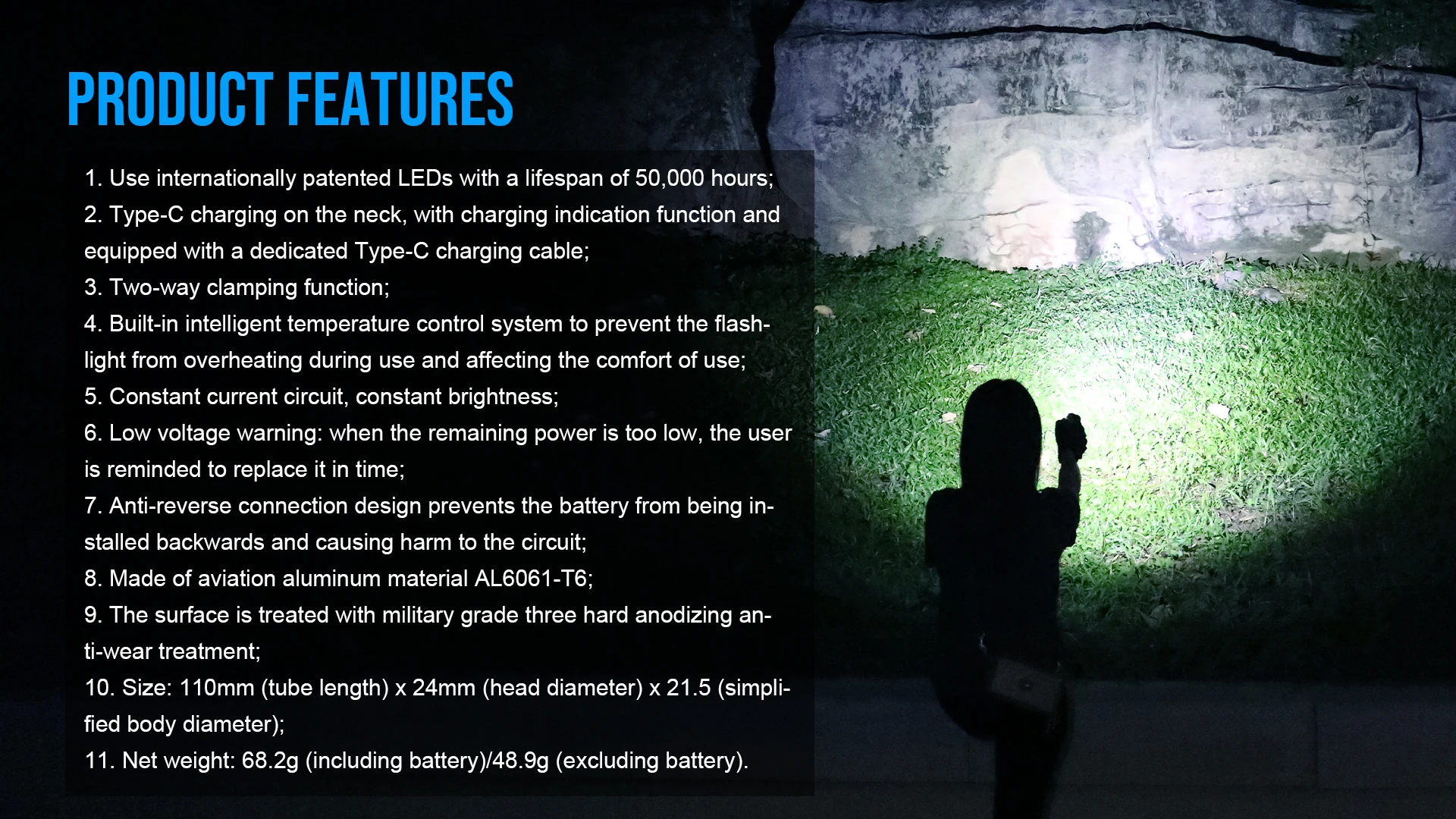 1. Utiliza LED patentados internacionalmente con una vida útil de 50.000 horas. 2. Carga tipo C en el cuello, con función de indicación de carga y
