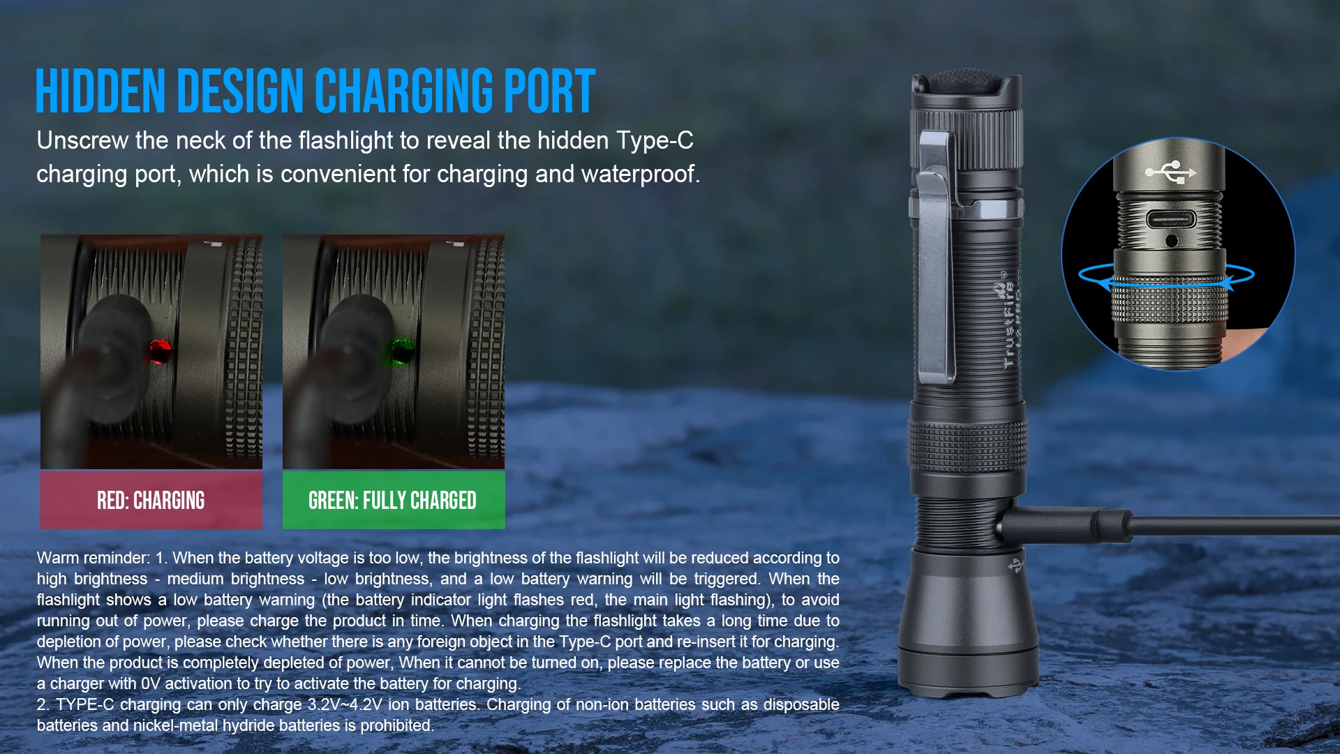Desenrosque el cuello de la linterna para revelar el puerto de carga tipo C oculto, que es conveniente para cargar e impermeable.