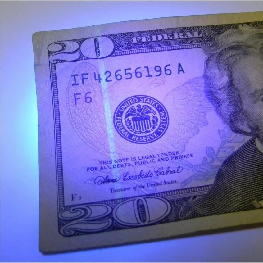 La luz ultravioleta de 365 nm es invisible a simple vista, por lo que no es tan BRILLANTE como la linterna de 395 nm, sino más perfecta para detectar una alta demanda como agentes fluorescentes y códigos de seguridad.UV de 365 nm es el espectro de detección realmente dedicado.Se puede utilizar con luz natural y funciona mejor en la oscuridad con poca fuga de luz visible.