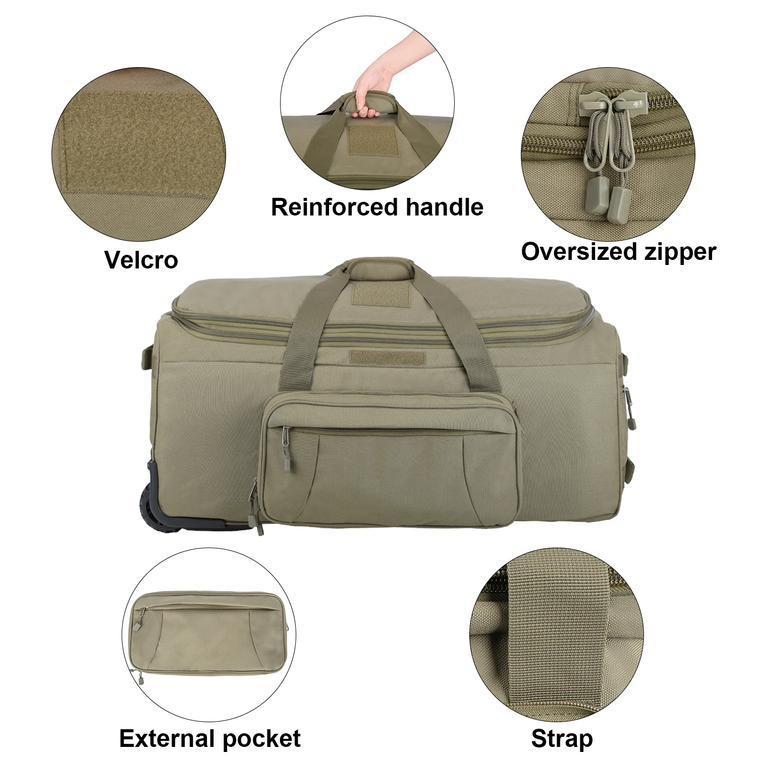 【Bolsa de lona con ruedas y asa】Esta bolsa de lona con ruedas tiene un compartimento principal, una bolsa lateral exterior para accesorios (extraíble), bolsillos pequeños y bolsillos.El compartimento de embalaje extragrande y acolchado con divisor ajustable facilita el almacenamiento, la separación y la organización del equipo.Asas de transporte superiores y traseras. Opciones de transporte versátiles para mayor comodidad.