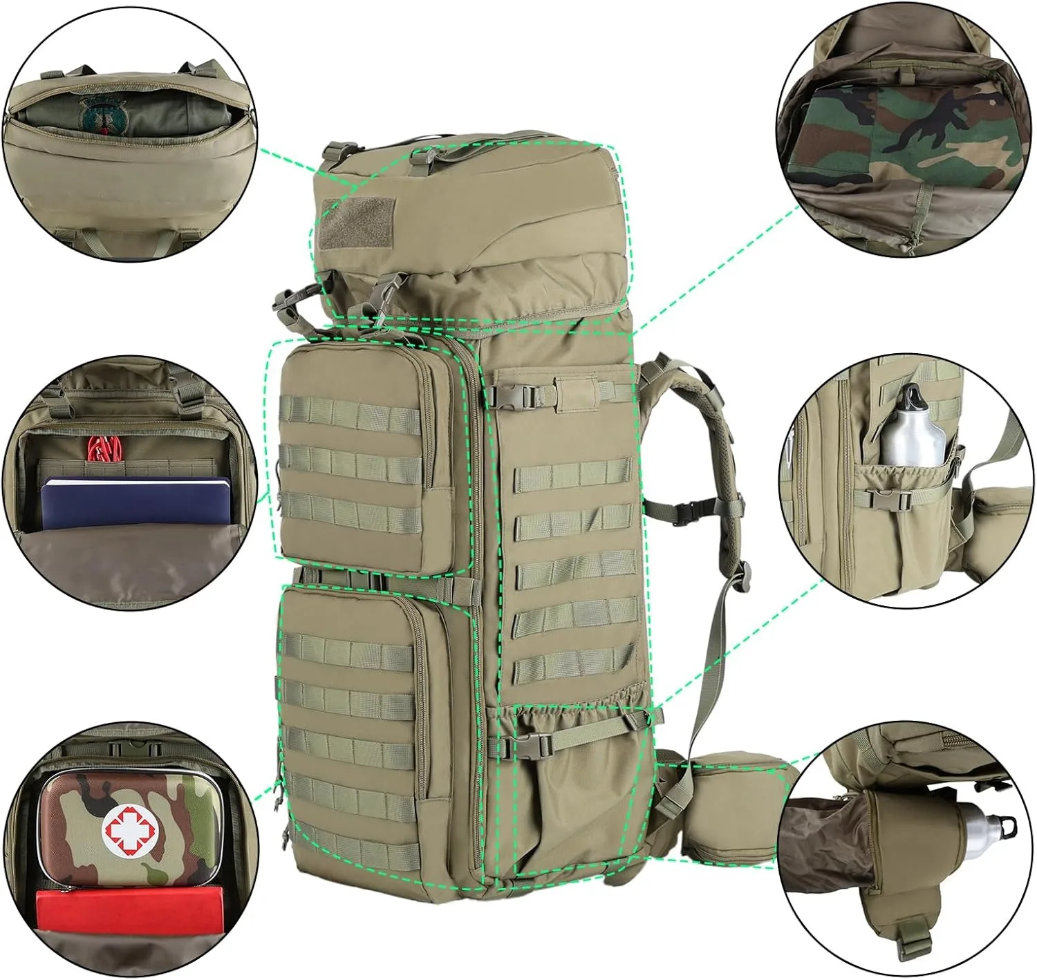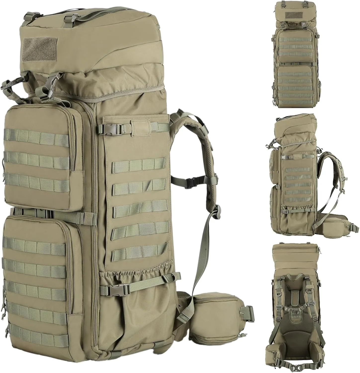 • Integración total de engranajes con el sistema MOLLE:Un verdadero caballo de batalla táctico, la cinta MOLLE completamente envolvente le permite personalizar de forma segura su carga.Conecte herramientas, bastones de trekking, tiendas de campaña y más sin esfuerzo.Las correas laterales y los bolsillos dedicados están diseñados incluso para transportar de forma segura un rifle para misiones de caza y supervivencia.