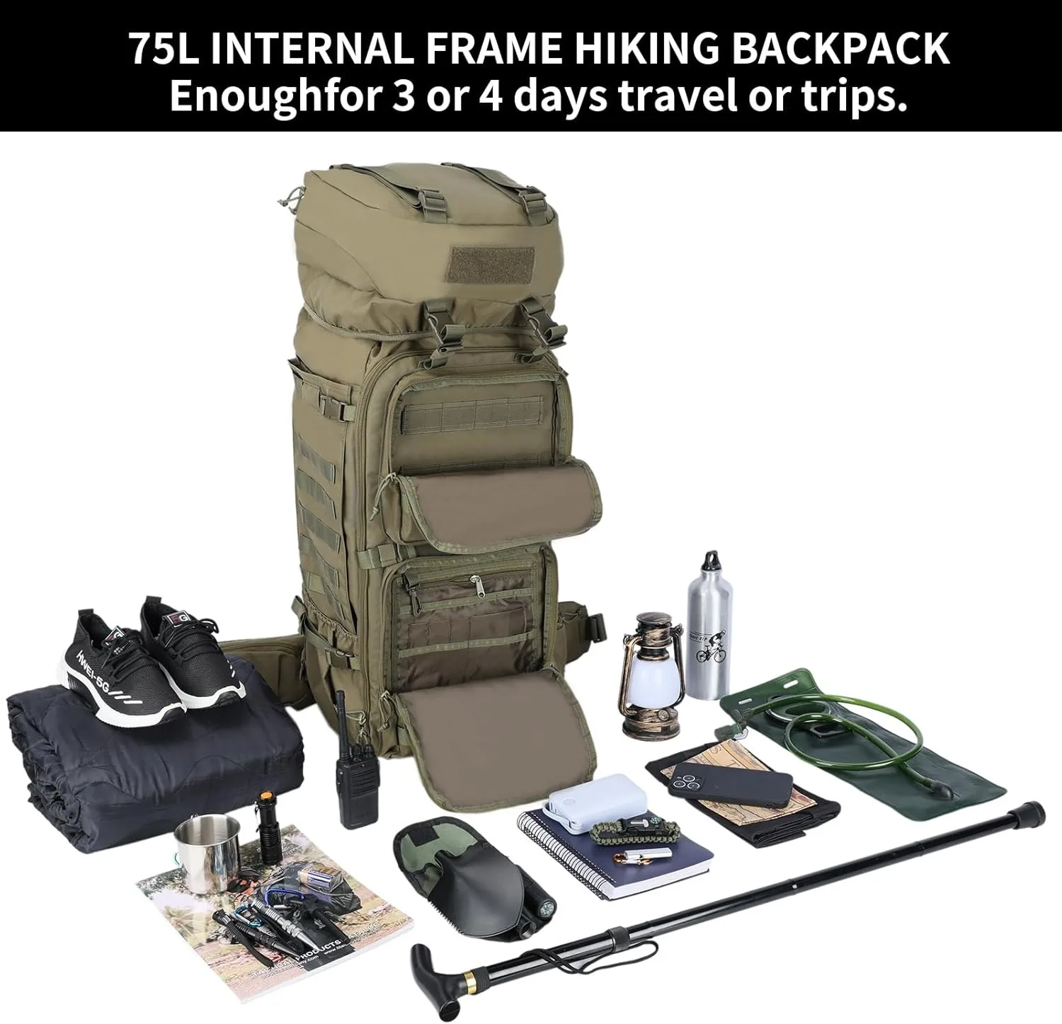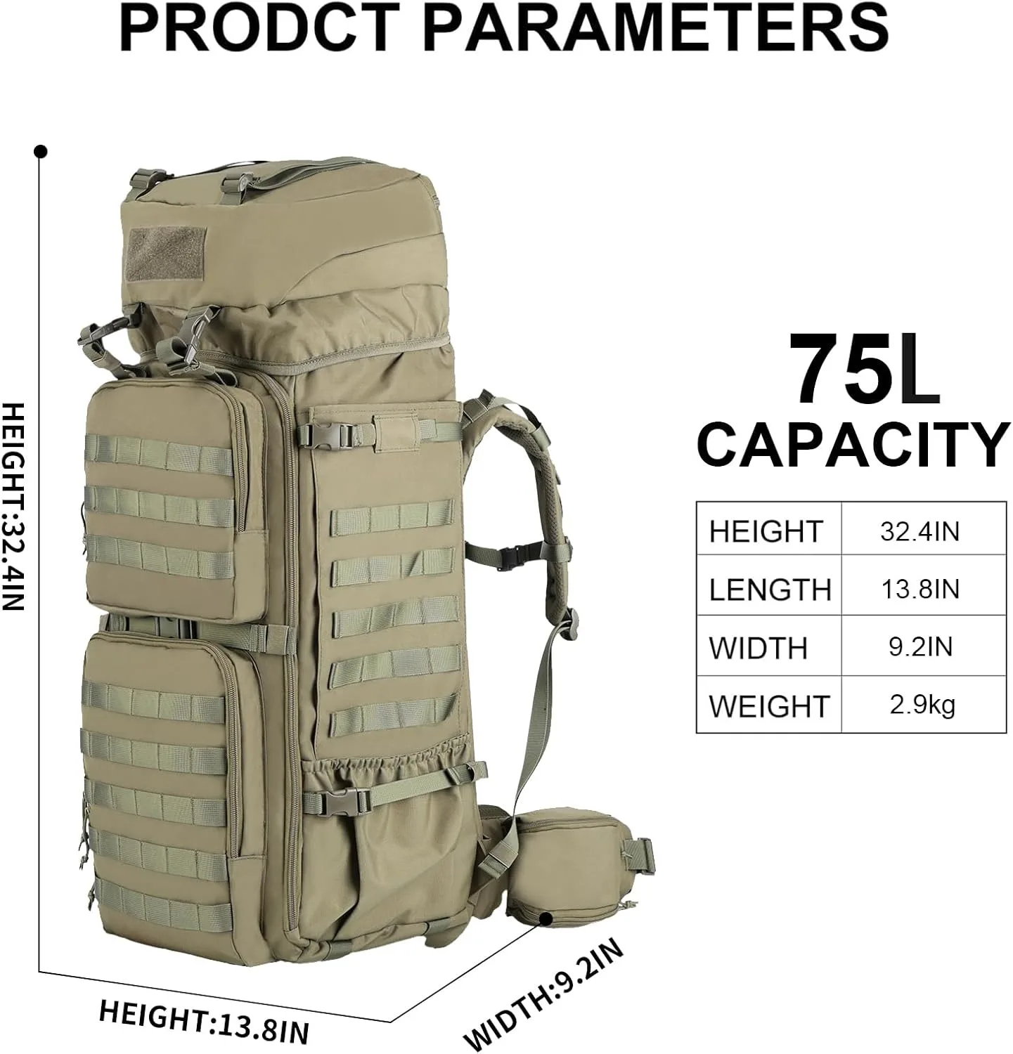 • Capacidad de 75 litros lista para misiones:Diseñado para operaciones prolongadas, este paquete de 75 litros es su mejor bolsa de asalto, insecución o expedición de 3 días. Sostenido por correas para el pecho que soportan carga, está diseñado para las demandas de cazar, viajar, escalar y cualquier misión al aire libre extendida.