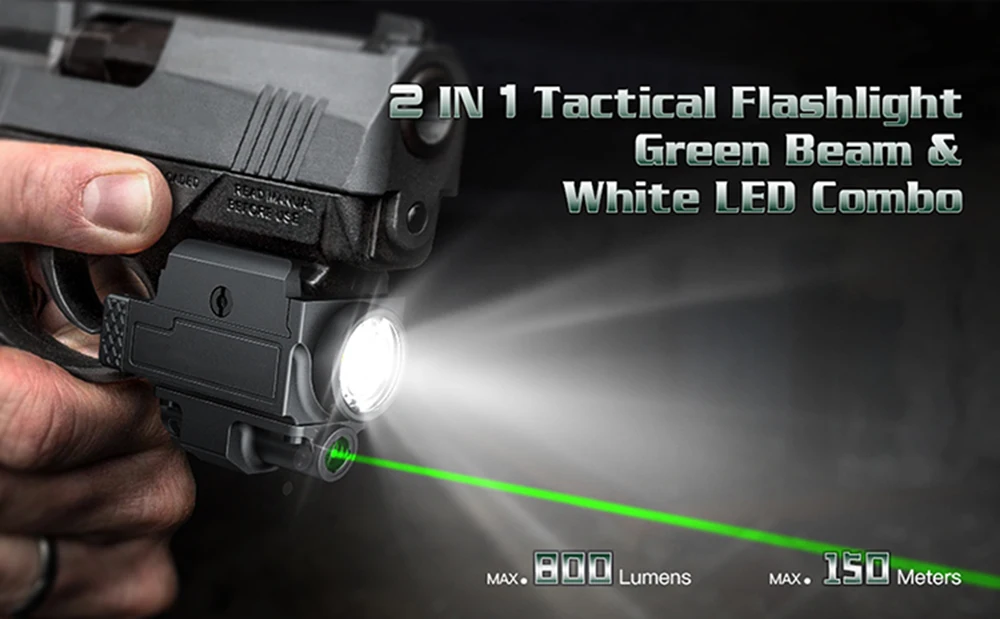 Las luces brillantes de 800 lúmenes y los láseres verdes precisos hacen que sus miras alcance hasta 800 pies y el objetivo sea fácilmente visible, Clase IIIA
