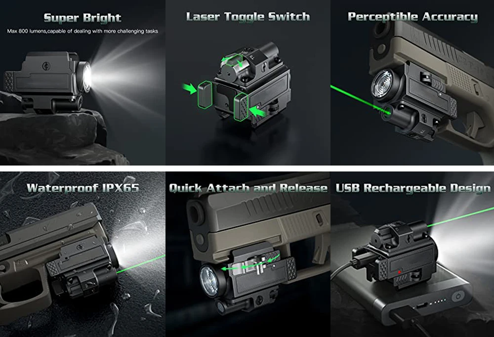 Luz de pistola de armas de 800 lúmenes Vista láser verde roja Luz de pistola LED Vermelho Verde Vista láser Combo Linterna recargable por USB Compatible con riel Picatinny/GL para la mayoría de las pistolas