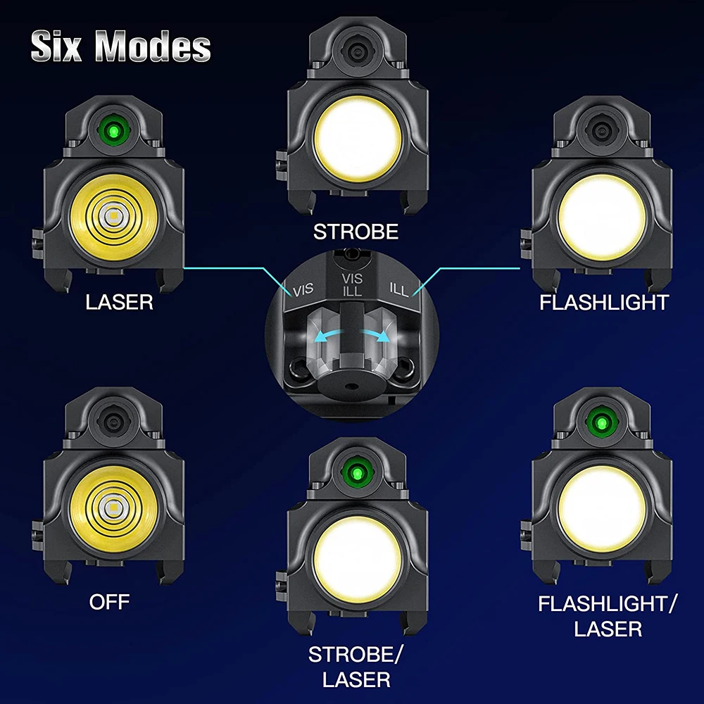 Los botones ON/OFF se encuentran en ambos lados del producto, el superior es el láser y el inferior es la luz, puede configurar esta linterna de pistola en cualquier modo: solo láser, solo linterna, láser y linterna juntos.