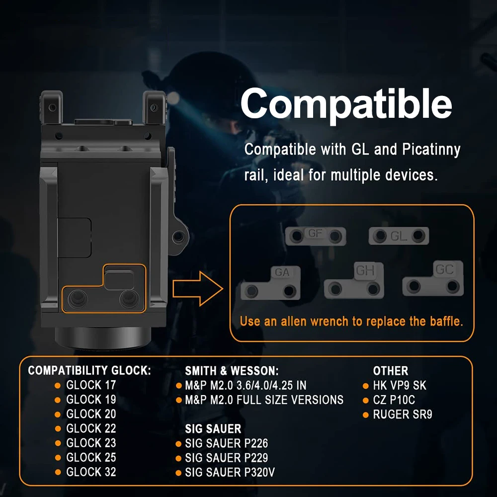 Esta linterna láser para pistola es compatible tanto con Picatinny Rails como con GL Rails (incluidos en el paquete), por lo que esta luz para pistola puede ser compatible con la mayoría de las pistolas.