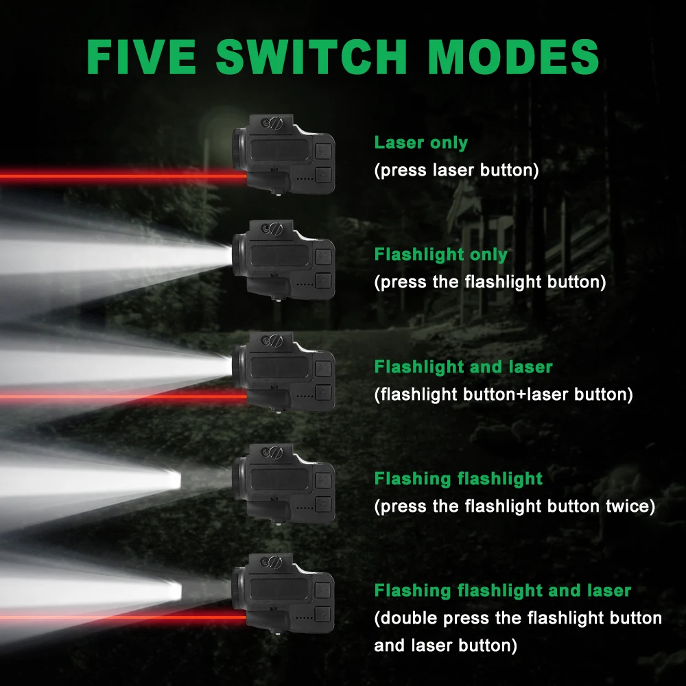 3.【Interruptor de funcionamiento y cinco modos】Interruptores duales en ambos lados de la luz de la pistola, puede activar esta luz con ambas manos;La luz LED y el láser verde se pueden operar de forma independiente, presione prolongadamente 1.5 s para ciclo constante y estroboscópico;Cinco modos: encendido constante, estroboscópico, solo láser, constante y láser, estroboscópico y láser.