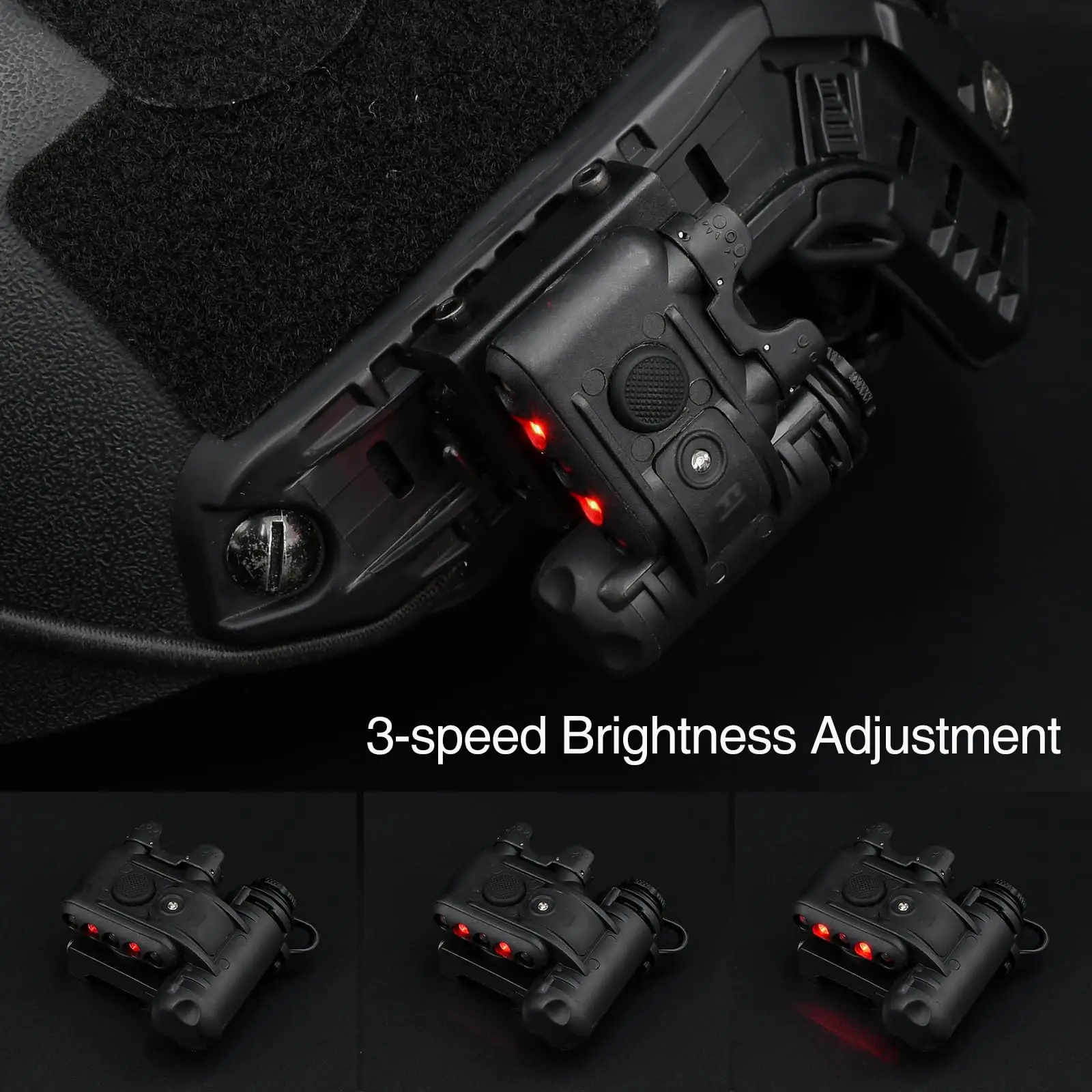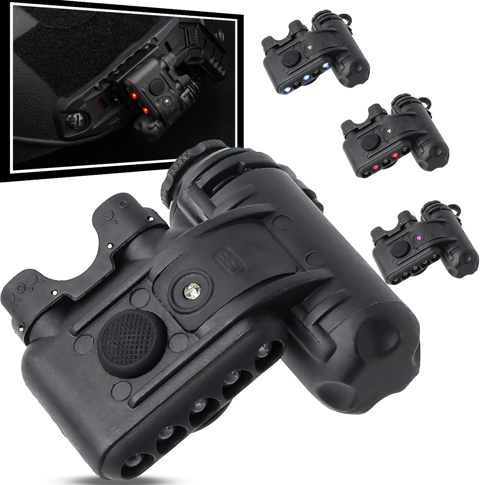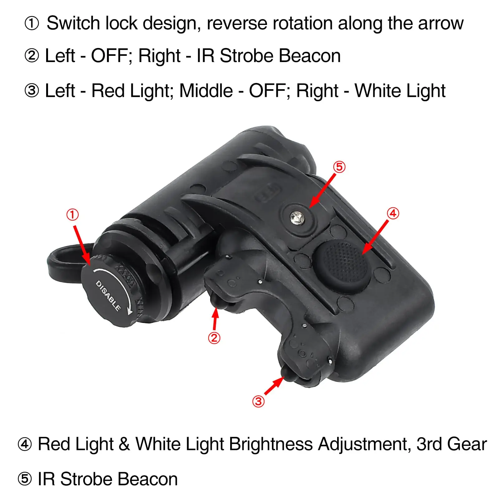 5 cuentas LED + casco táctico con luz militar IFF con 3 modos de luz: luz blanca + luz roja + luz estroboscópica IFF, luz blanca/roja con brillo de 3 ° engranaje, 2 cuentas de luz son de luz roja y 3 cuentas de luz son de luz blanca.