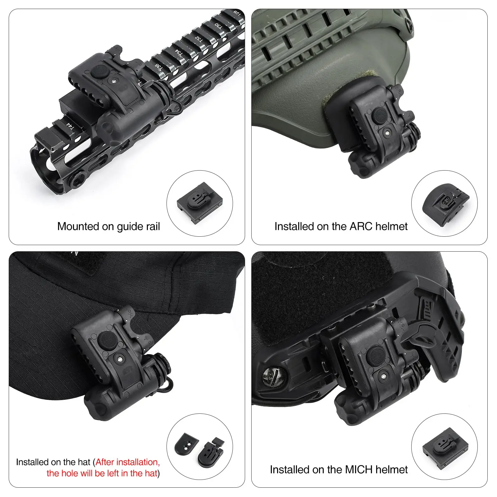 Equipado con accesorios de montaje de luz para casco, se puede montar en más tipos de sistemas como casco ARC/MICH casco/riel de guía/sombrero. ¡Después de la instalación, el agujero se dejará en el sombrero! Se puede instalar según el manual de instrucciones.