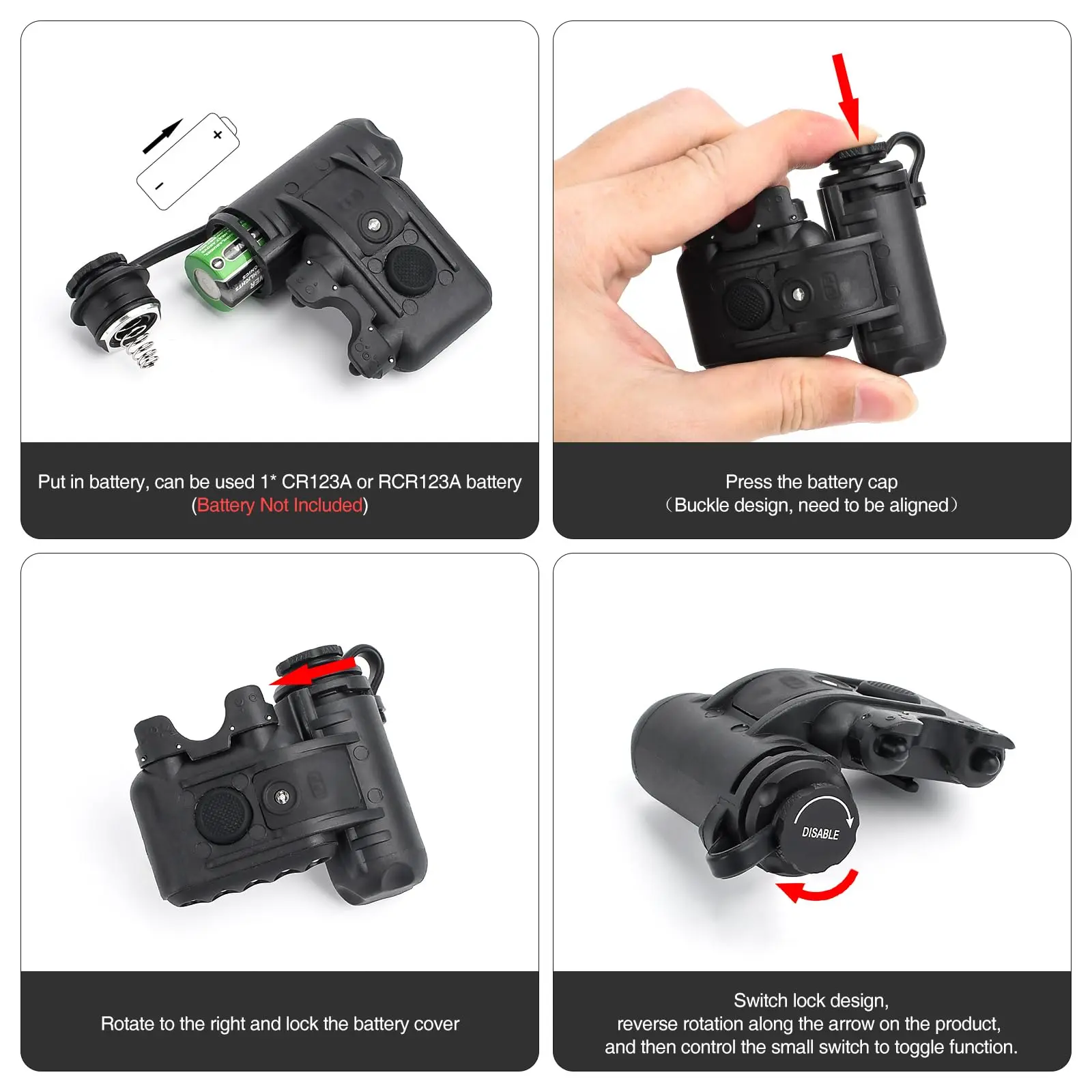 Se puede utilizar 1 * batería CR123A o RCR123A (batería no incluida). Presione la tapa de la batería (El diseño de la hebilla debe estar alineado), gire hacia la derecha y bloquee la tapa de la batería. Retire la batería cuando no esté en uso para evitar que se quede sin electricidad.