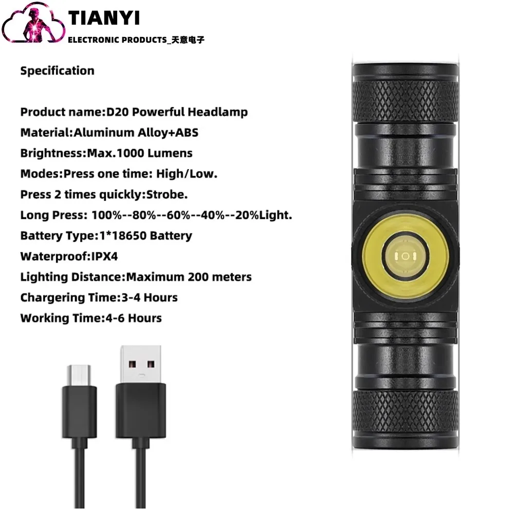 Luz de enfoque D20, faro súper brillante, faro especial para iluminación exterior, conveniente carga tipo C, batería de litio 18650