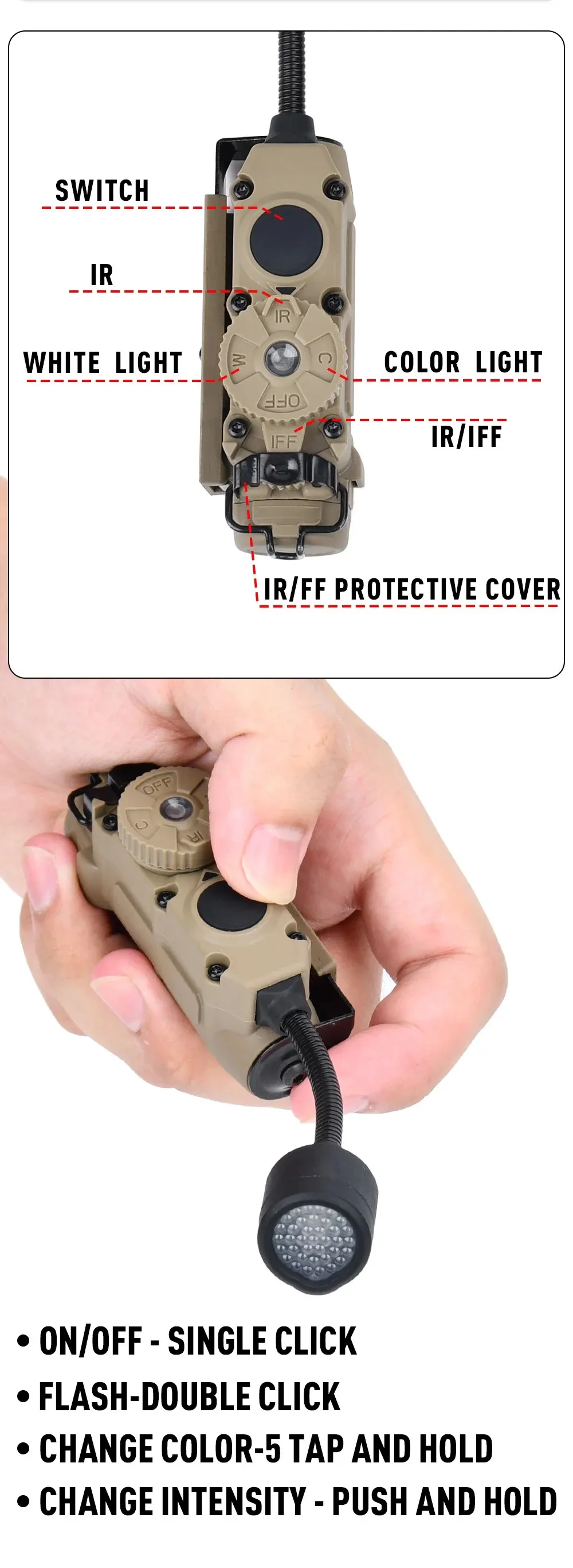Este casco táctico Sidewinder Light IFF Light-Lámpara de desierto está hecho completamente de material sintético resistente a los impactos. Se puede montar fácilmente en el riel de accesorios ARC de un casco táctico.
