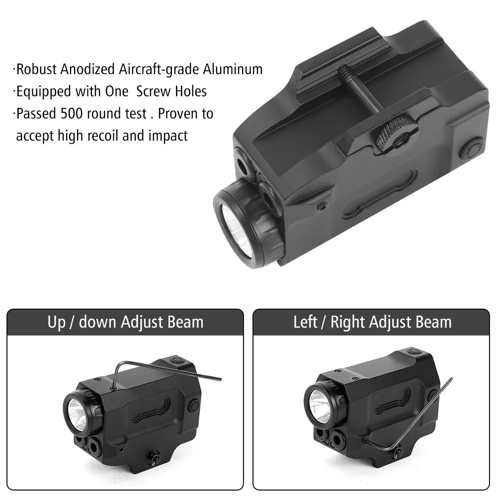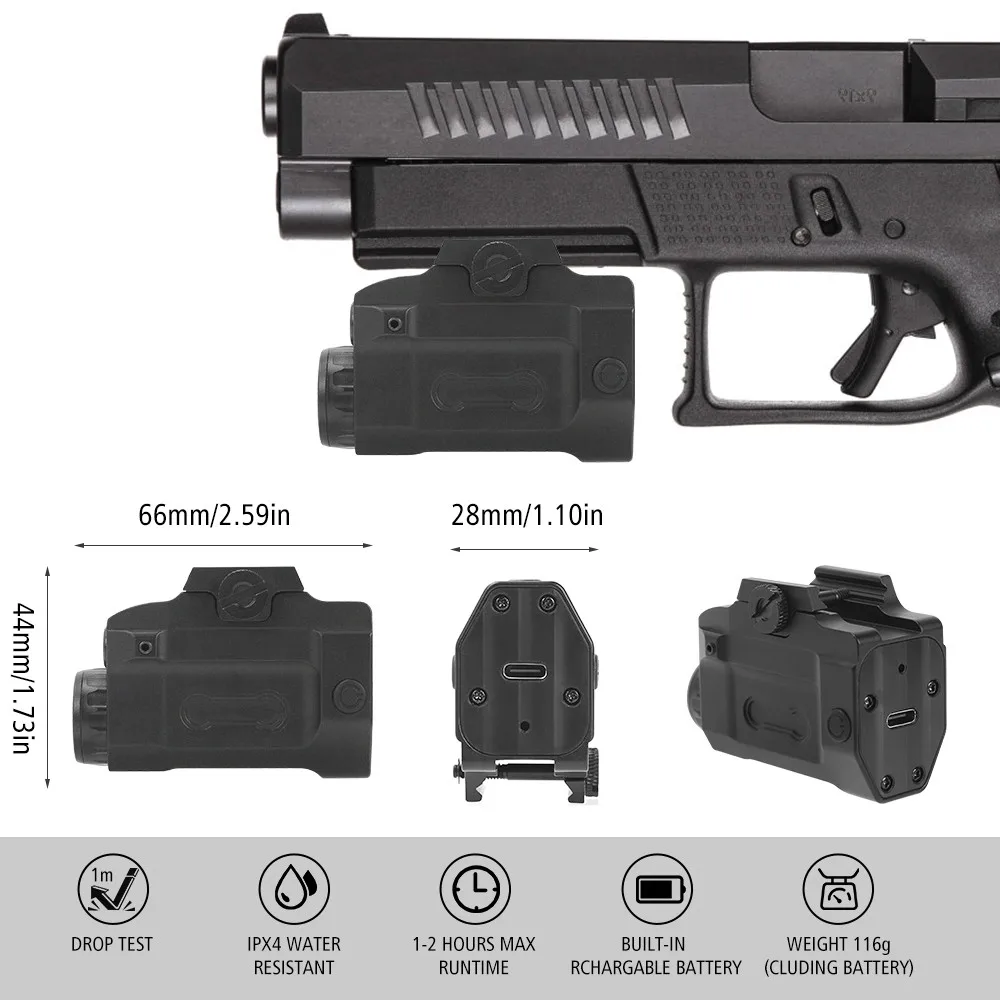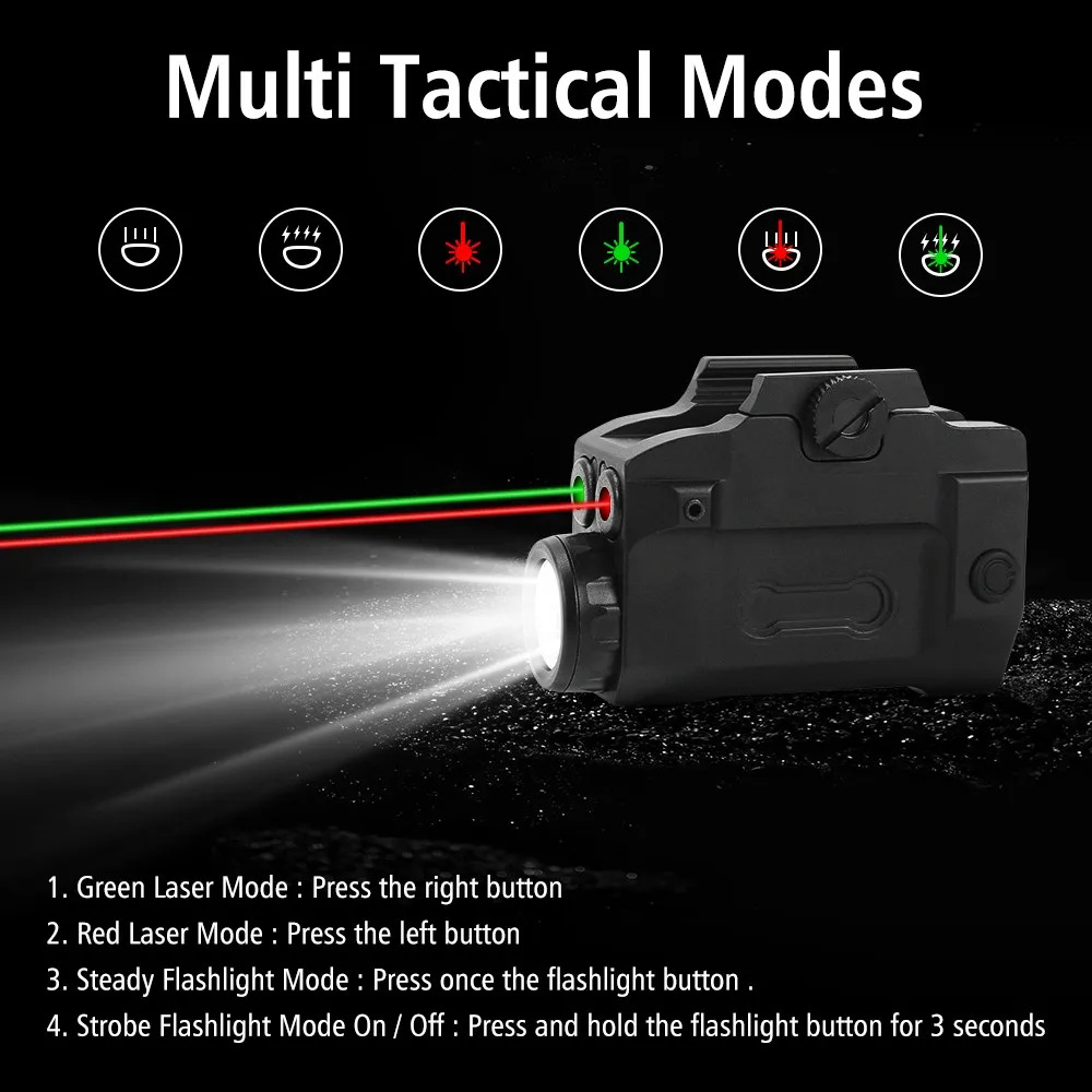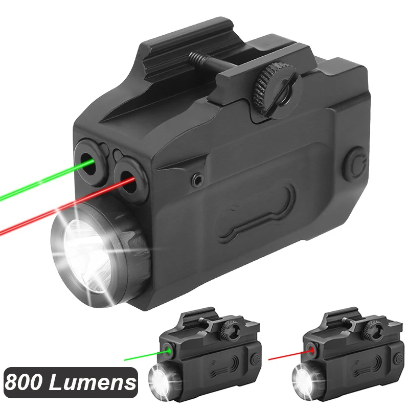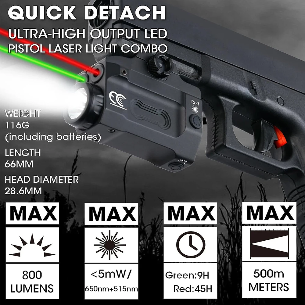 - Rayos láser verdes/rojos: 5 mW, Clase IIIA, el láser de pistola de 800 lúmenes incluye modos de encendido/estroboscópico constante.