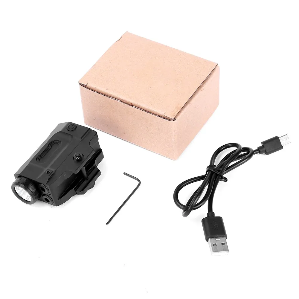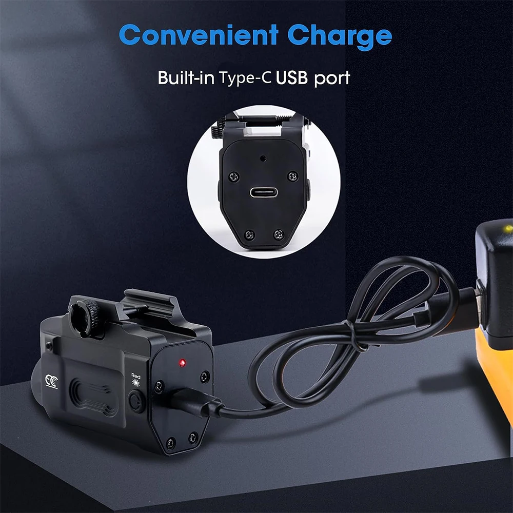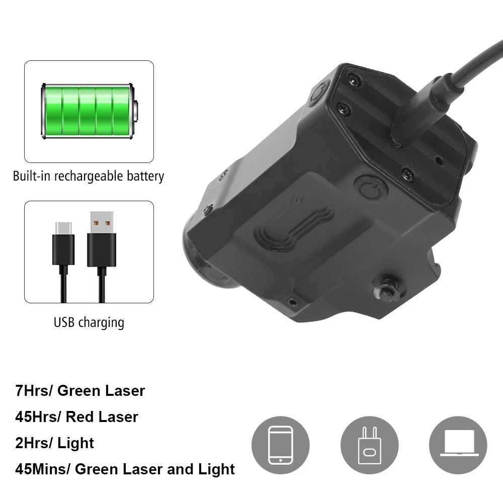 - La linterna LED y el rayo láser rojo/verde para la batería recargable incorporada de la pistola, que se carga con un enchufe de puerto USB-C.