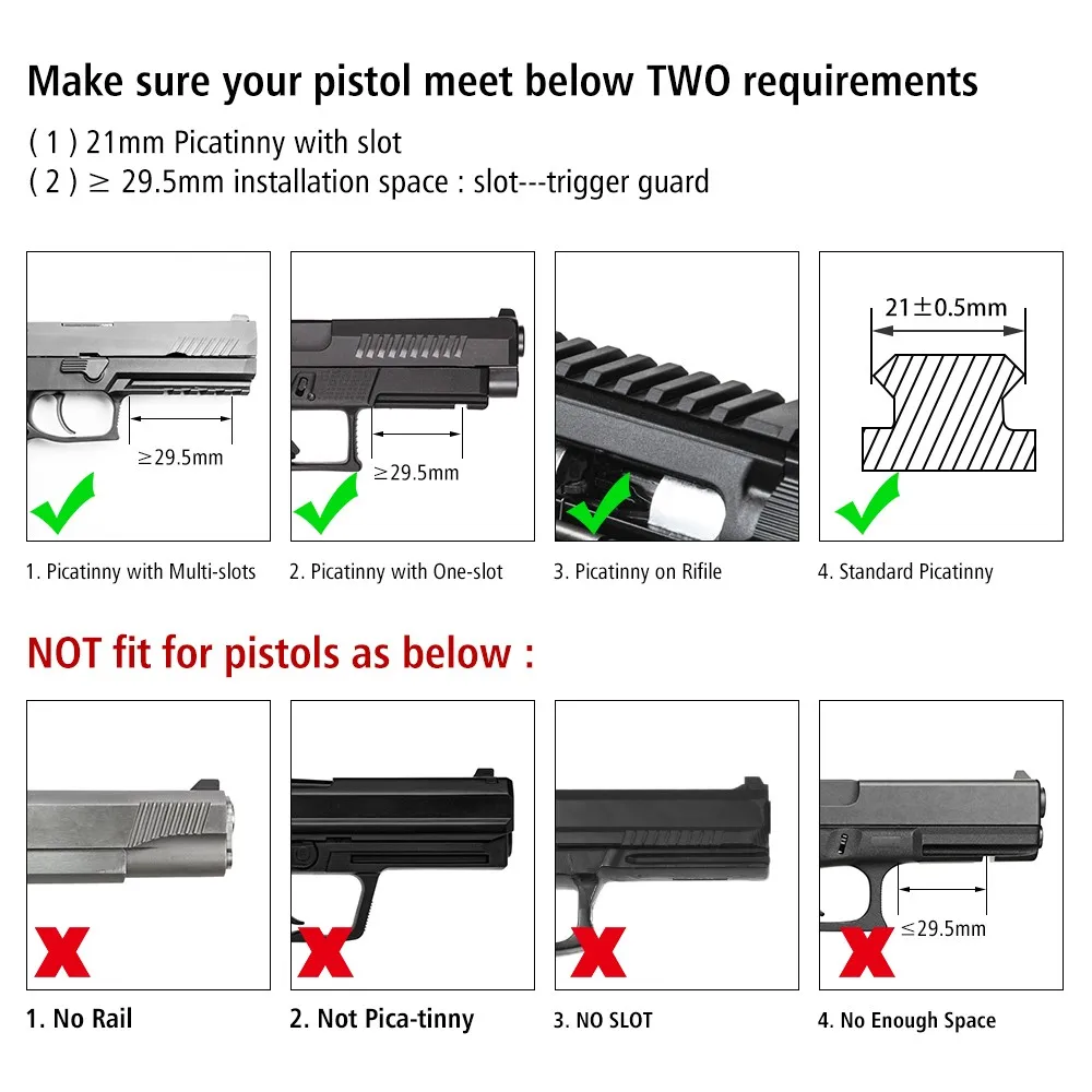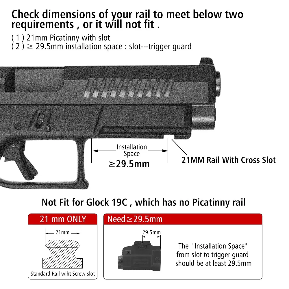 - Nuestra combinación de luz láser es compatible con pistolas de riel picatinny/weaver (rieles con un espacio libre superior a 29,5 mm).