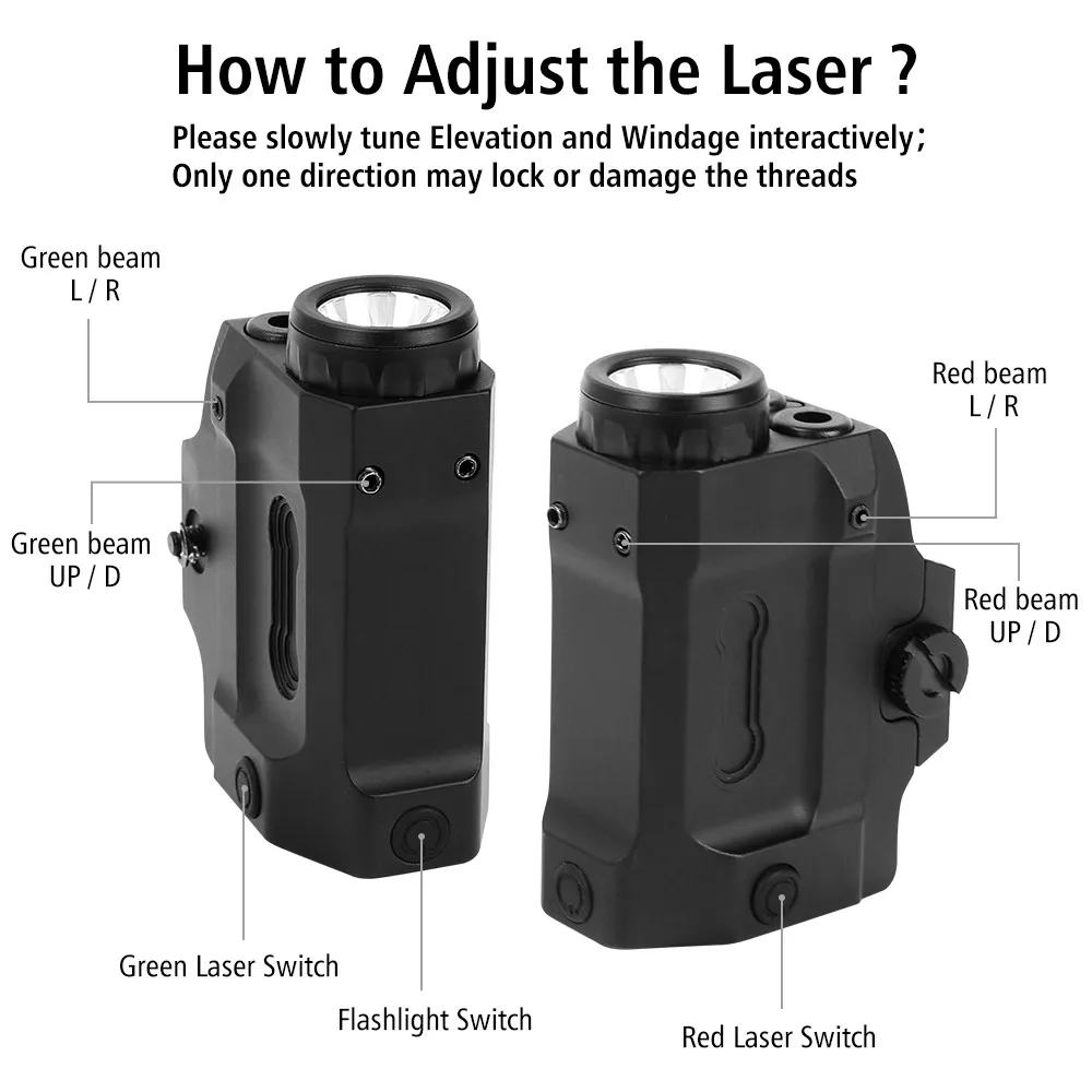 - El robusto material de aleación de aluminio anodizado de calidad aeronáutica hace que el rayo láser rojo y verde sea firme y estable, nuestra combinación de láser de luz de pistola puede soportar impactos y vibraciones.